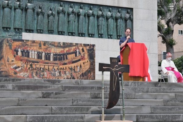 (1)西坂公園での式典の中で講話するデ・ルカ・レンゾ師。二十六聖人像の前には「元和大殉教図」を拡大したパネルが置かれた。手前に見える十字架は韓国殉教福者聖職修道会の神学生たちが作成した木製のもの。