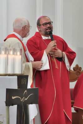 (9)ミサの最後に、元和の大殉教の殉教者の一人、アンゼロ・オルスッチ神父の出身地ルッカからの巡礼団を代表し、あいさつするパオロ・ジュリエッティ大司教。ともに祈りをささげることができたことへの感謝を語った。