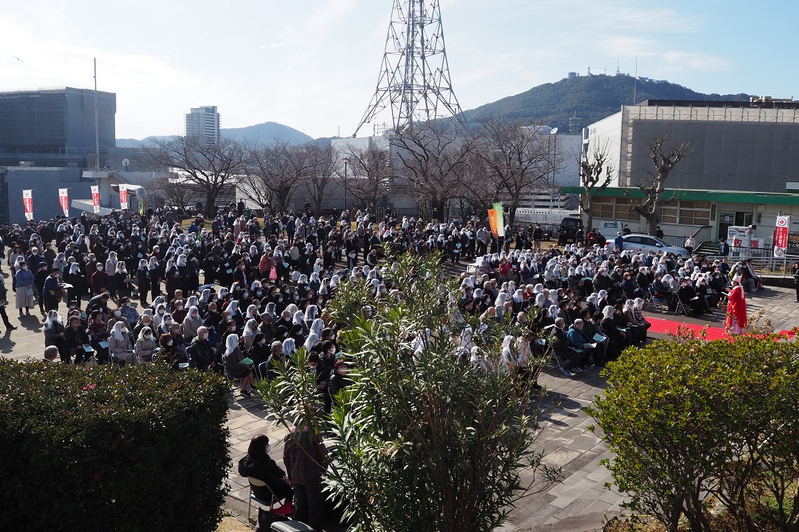 2月5日(日)14時から西坂公園で、中村倫明大司教の主司式、髙見三明名誉大司教と約40人の司祭団の共同司式のもと、日本二十六聖人殉教記念ミサが行われた。「西坂の丘」を目指し各地から集まった約1200人が、殉教者を思い、共に祈りをささげた。