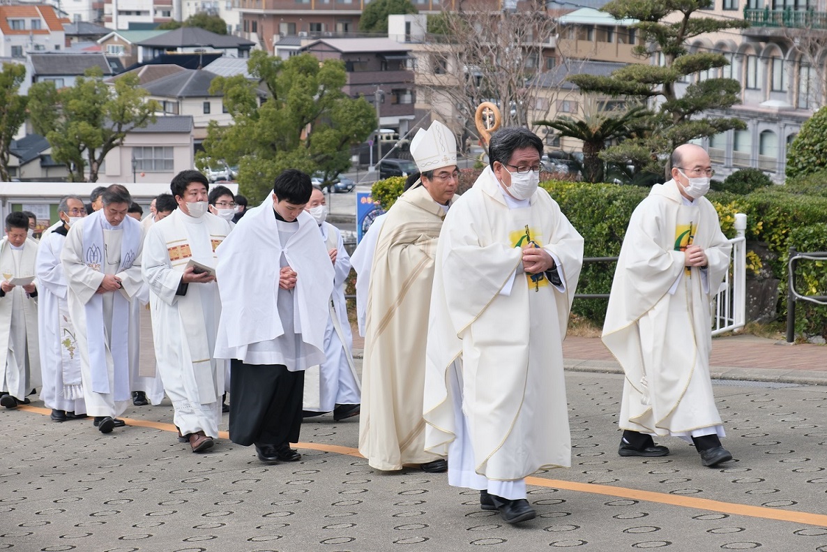 14時。参加者ははじめに浦上教会信徒会館に集い、中村倫明大司教の招きの言葉によって聖歌を歌いながら巡礼行列をし、聖堂正面の扉の前に集まった。その後、大司教によって司教座聖堂の扉が開かれ、司教・司祭団、修道者や信徒たち多くの人々が扉から入堂。入堂後は皆が見守る中で被爆十字架の開示、被爆十字架と祭壇への献香、聖水による灌水が行われ、美しい聖歌の歌声が響く中、大きな希望のうちに祈りがささげられた。