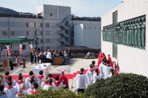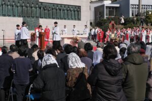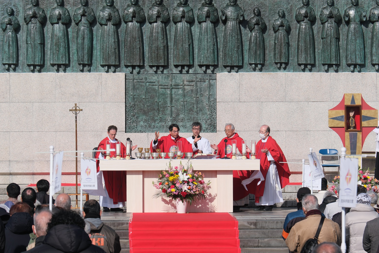 日本の教会は2月5日を、日本二十六聖人殉教者(聖パウロ三木と同志殉教者)の祝日として記念している。この日を前に2月2日(日)、長崎大司教区は14時から西坂公園で殉教記念ミサを行った。中村倫明大司教が主司式を務め、髙見三明名誉大司教と約50人の司祭団が共同司式をし、各地から集まった約1500人が殉教者を思い、祈りをささげた。(写真はミサの様子)