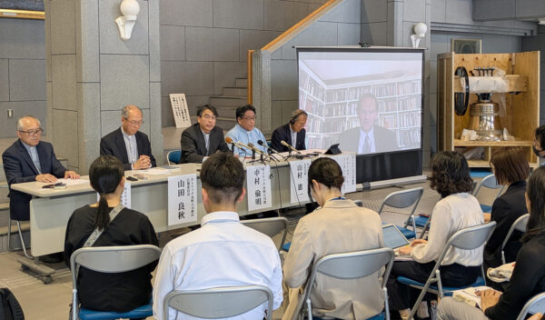 アメリカの人々から日本の人々へ新しい鐘が贈られたことを知ってもらうため、浦上教会と長崎大司教区は5月15日(木)10時から長崎大司教館で記者会見を開き、寄贈された鐘を披露した。会見者は、中村倫明大司教、浦上教会主任の山村憲一師、浦上教会出身で鐘にゆかりのある山田良秋師(教区広報委員長)、また、オンラインでノーラン氏が出席し、通訳は城山教会の今田昌樹師(聖アウグスチノ修道会)、司会は教区本部事務局長の葛嶋秀信師が務めた。中村大司教からは、鐘が「ともに世界平和の実現に向かって歩む大きな希望の証し」であることが強調され、語られた。