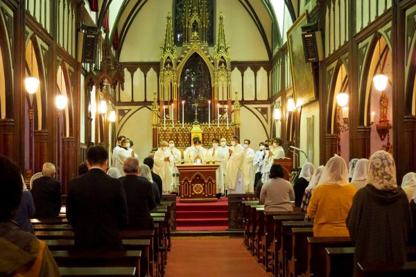 3月17日 日本の信徒発見の聖母記念ミサ Blog 2022.03.18 3月17日(木)19時から大浦天主堂で日本の信徒発見の聖母記念ミサが行われた。 ミサは中村倫明大司教が主司式を、12人の司祭が共同司式をし、参加した修道者、信徒が共に祈りをささげた。