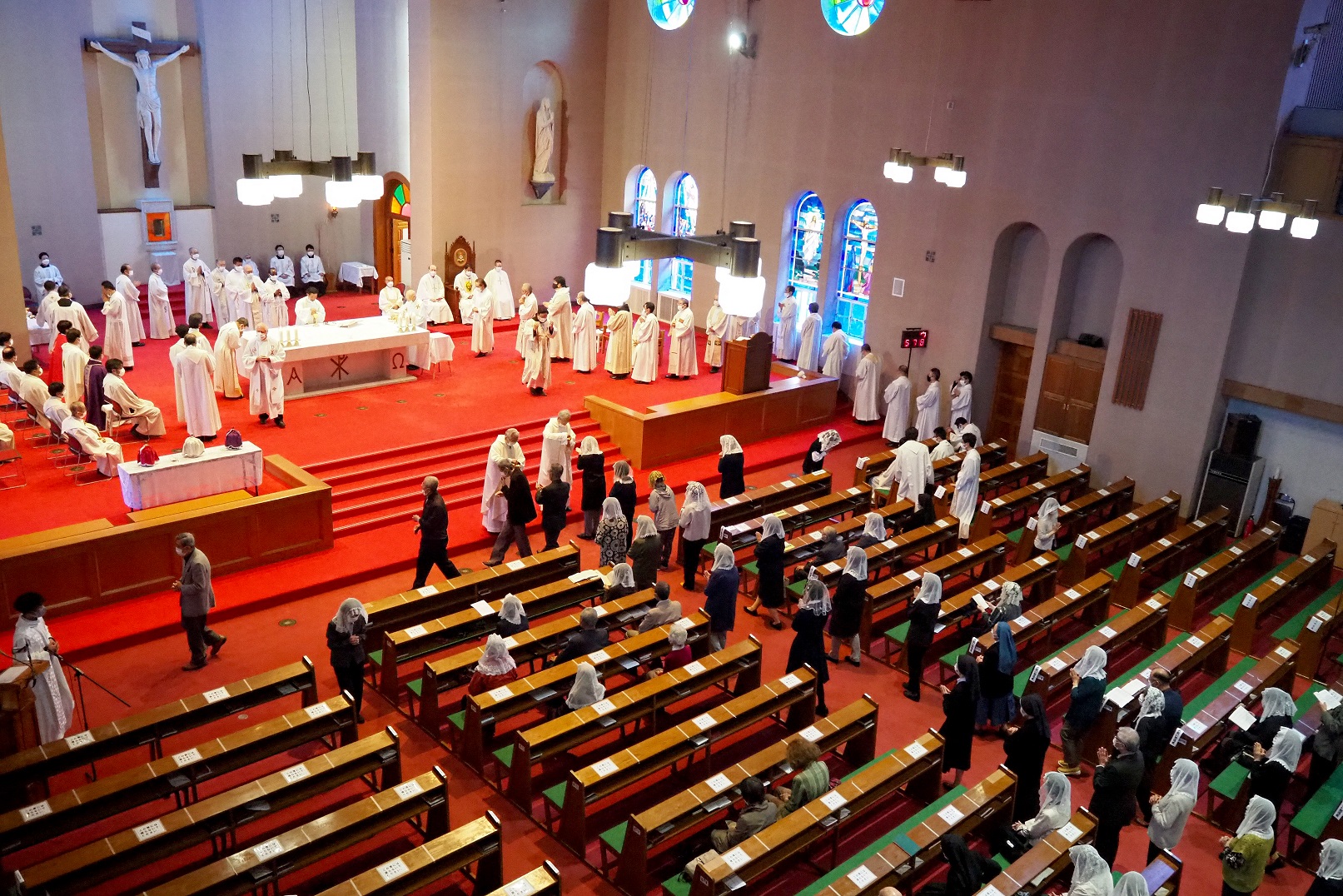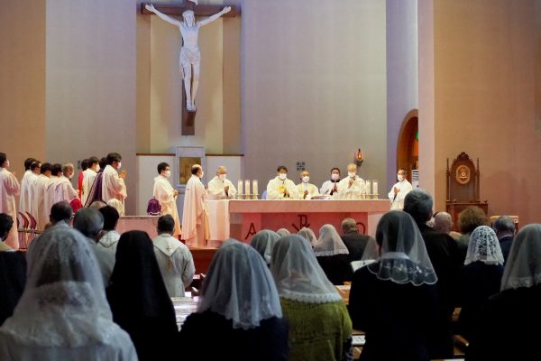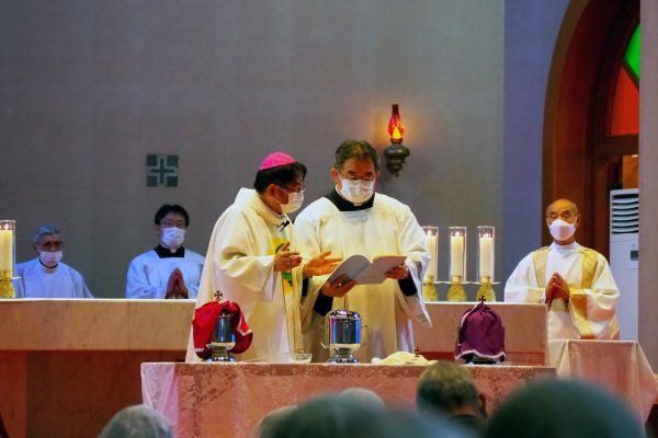 4月12日(火)10時30分から浦上教会で聖香油ミサが行われ、主司式を務めた中村倫明大司教と約70人の司祭団、約150人の信者が共に祈りをささげた。