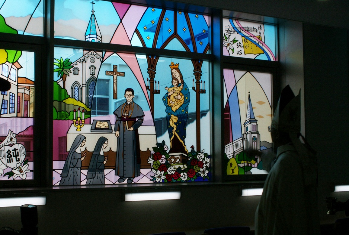5月1日 純心中学校・純心女子高等学校 マリア館祝福式 Blog 2013.05.01 5月1日、長崎市文教町にある純心中学校・純心女子高等学校で新校舎マリア館(本館)の祝福式が髙見三明大司教の司式により行われた。 5階建ての新校舎は図書館や学習コーナー、特別教室などがより機能的に整備され、またエレベーター、スロープなどバリアフリー化を目指してデザインされている。 全校生徒や関係者らの参列のもと、髙見大司教が各階をまわって聖水をふりかけ新校舎を祝福した。 【写真】 祝福式にて髙見大司教のお話/新校舎の祝福/純心学園のあゆみをつづったステンドグラスの祝福