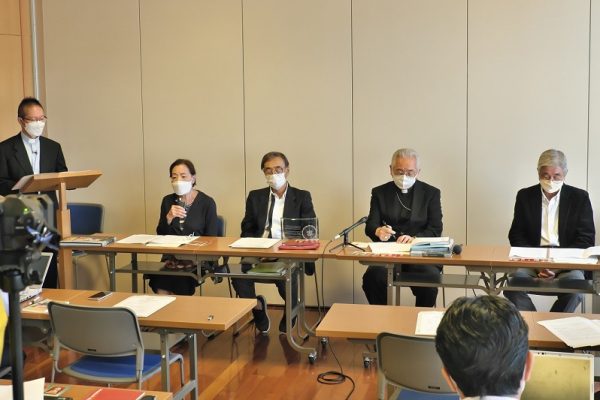 この報告の記者会見が、10月13日(木)浦上教会司祭館で行われた。会見では、はじめに髙見大司教が「核兵器廃絶に向けて何かができるという希望を抱かせるような巡礼になった」とあいさつし、巡礼者たち一人ひとりから訪問先での交流の様子や感想が伝えられ、その後、質疑応答があった。巡礼者からは「(平和に向けて)もっと行動しなければと思った」「原爆のことはまだ知られていない。伝えるべきことを伝えていかないといけないと感じた」などの話しがあった。(写真は会見の様子)