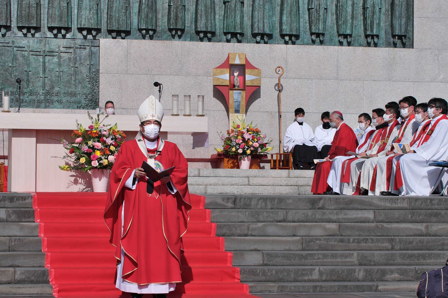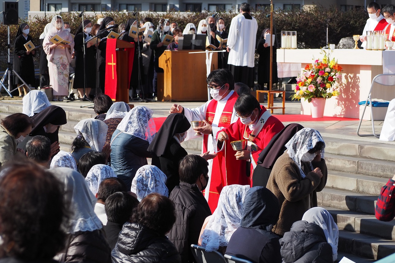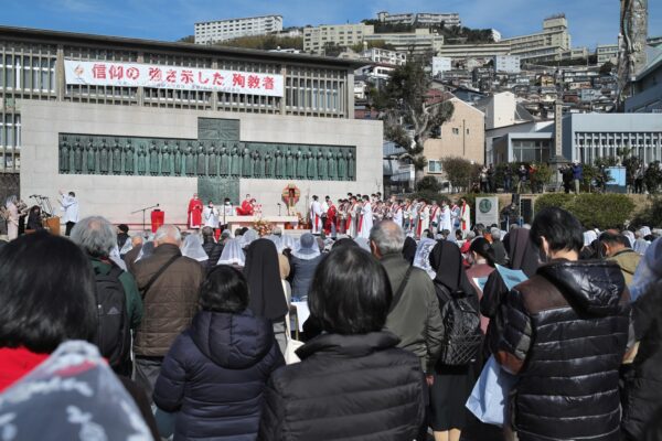 2月5日(日)14時から西坂公園で、中村倫明大司教の主司式、髙見三明名誉大司教と約40人の司祭団の共同司式のもと、日本二十六聖人殉教記念ミサが行われた。「西坂の丘」を目指し各地から集まった約1200人が、殉教者を思い、共に祈りをささげた。