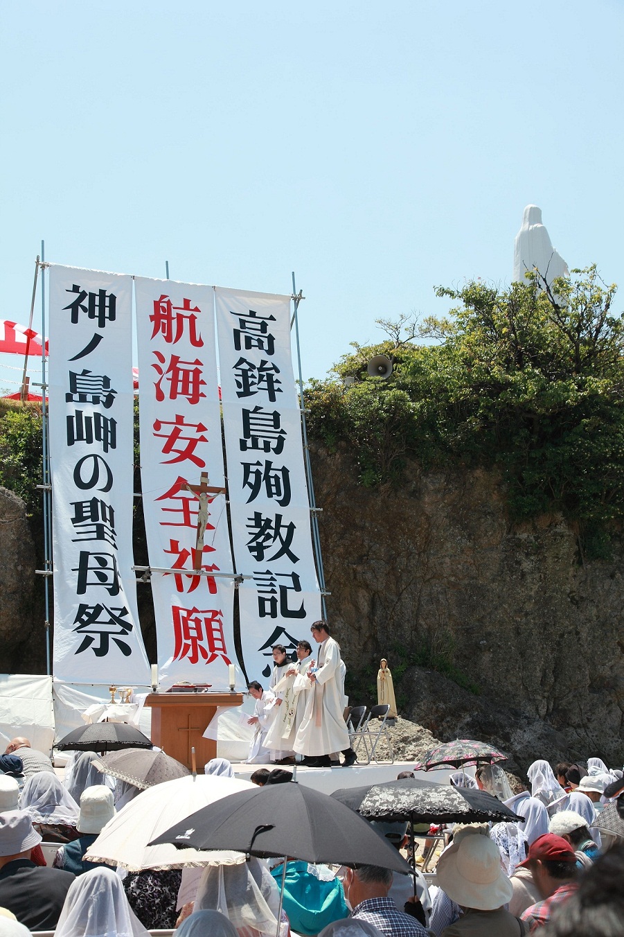 5月5日 神ノ島・岬の聖母祭 Blog 2013.05.072013.05.08 5月5日、神ノ島小教区は聖母行列と野外ミサを行い、長崎湾を見守る聖母マリアをたたえた。 毎年聖母月の第1日曜日に行われるこのミサでは、航海の安全を祈願するとともに高鉾島で殉教した信者たちをしのび祈りがささげられている。 【写真】野外ミサ・写真右上は岬の聖母像/長崎港入り口の高鉾島