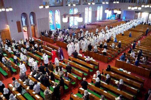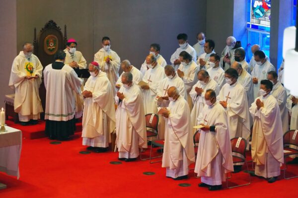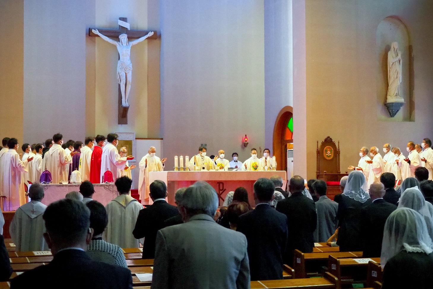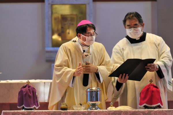4月4日(火)10時30分から浦上教会で聖香油ミサが行われ、中村倫明大司教の主司式、髙見三明名誉大司教と80人を超える司祭団の共同司式のもと、集まった約200人の信者らが祈りをささげた。