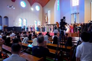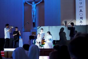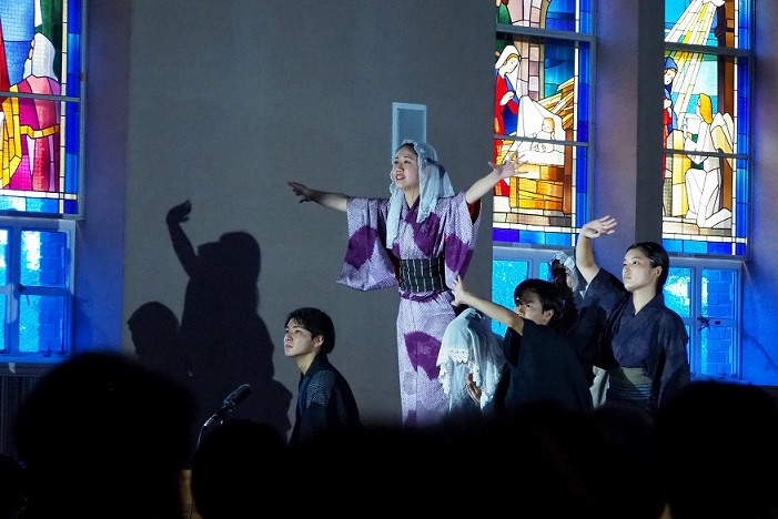 浦上四番崩れによって浦上信徒らが全国22カ所に流配された出来事『旅』からの帰還150周年にあたり、長崎大司教区は5月のロザリオ行列とミサに続いて、7月23日(日)に記念行事を行った。今回は長崎県高等学校文化連盟演劇専門部の協力を得て、長崎県内5つの高校(純心女子、長崎南山、海星、県立長崎北、創成館)の演劇部員約50人が「岩永マキ物語~Great Mother」の舞台づくりに携わり上演された。会場となった浦上教会には出演者とスタッフを含め学校・教会関係者ら約800人が集まり、皆で感動を分かち合った。