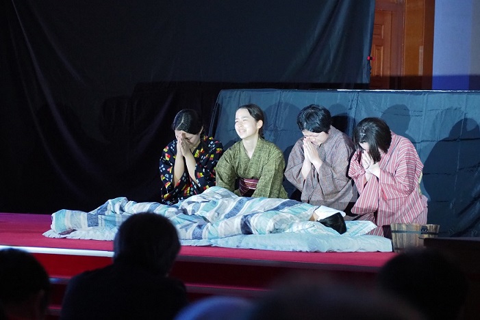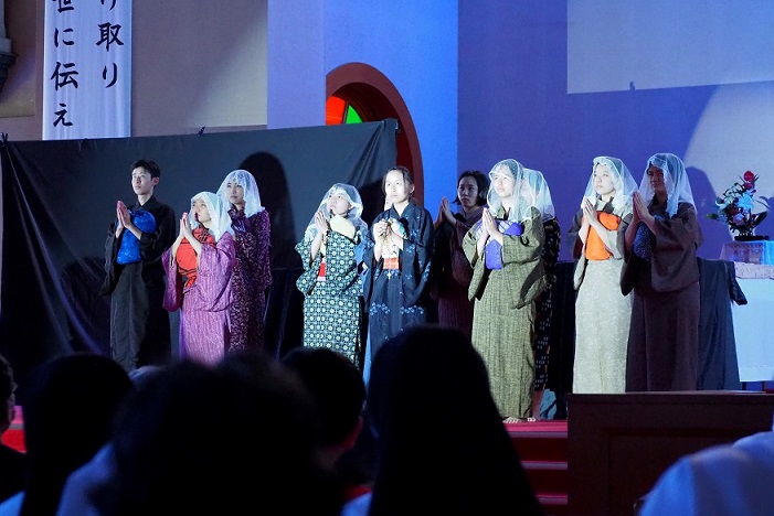 物語は現代の場面から始まり、被爆者・澄子に被爆体験をインタビューする中で浦上キリシタンの〝受難〟について語られるところとなり、澄子が伝え聞いた話を表現する形で進む。信徒発見から浦上四番崩れ、『旅』。『旅』から帰還した一人で日本の福祉事業の礎を築いたといわれる岩永マキ(1849~1920年)が人々のために奔走し亡くなるまでが描かれ、終演後は高校生の熱演に大きな拍手が送られた。