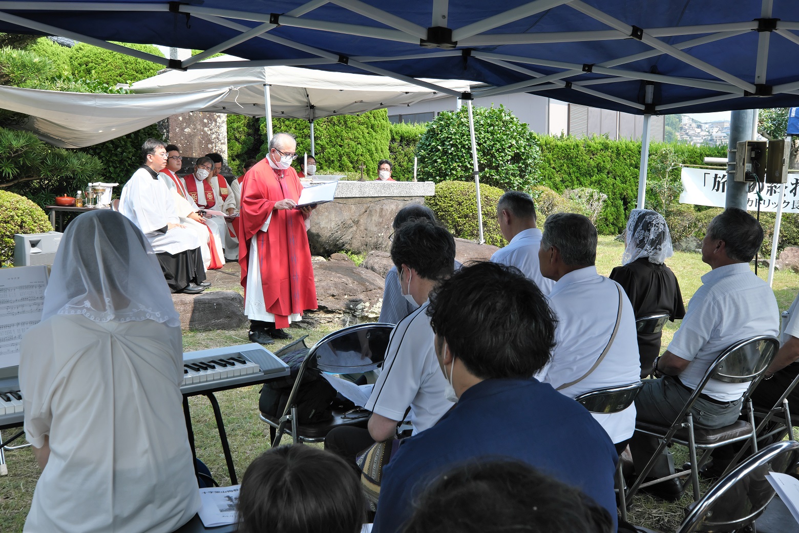 9月10日(日)長崎市辻町の十字架山で殉教祭が行われ、150人を超える信者が集まり共に祈った。この殉教祭は例年、浦上小教区をはじめとする長崎中地区の教会が中心となってささげており、『旅』の終わり150周年にあたる今年は長崎教区主催として行われた。ミサの主司式は中村倫明大司教に代わり、葛嶋秀信師(教区本部事務局長)が務め、他7人の司祭が共同司式をした。