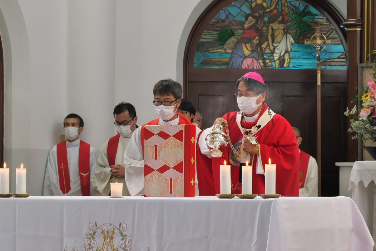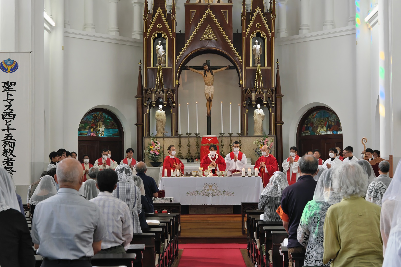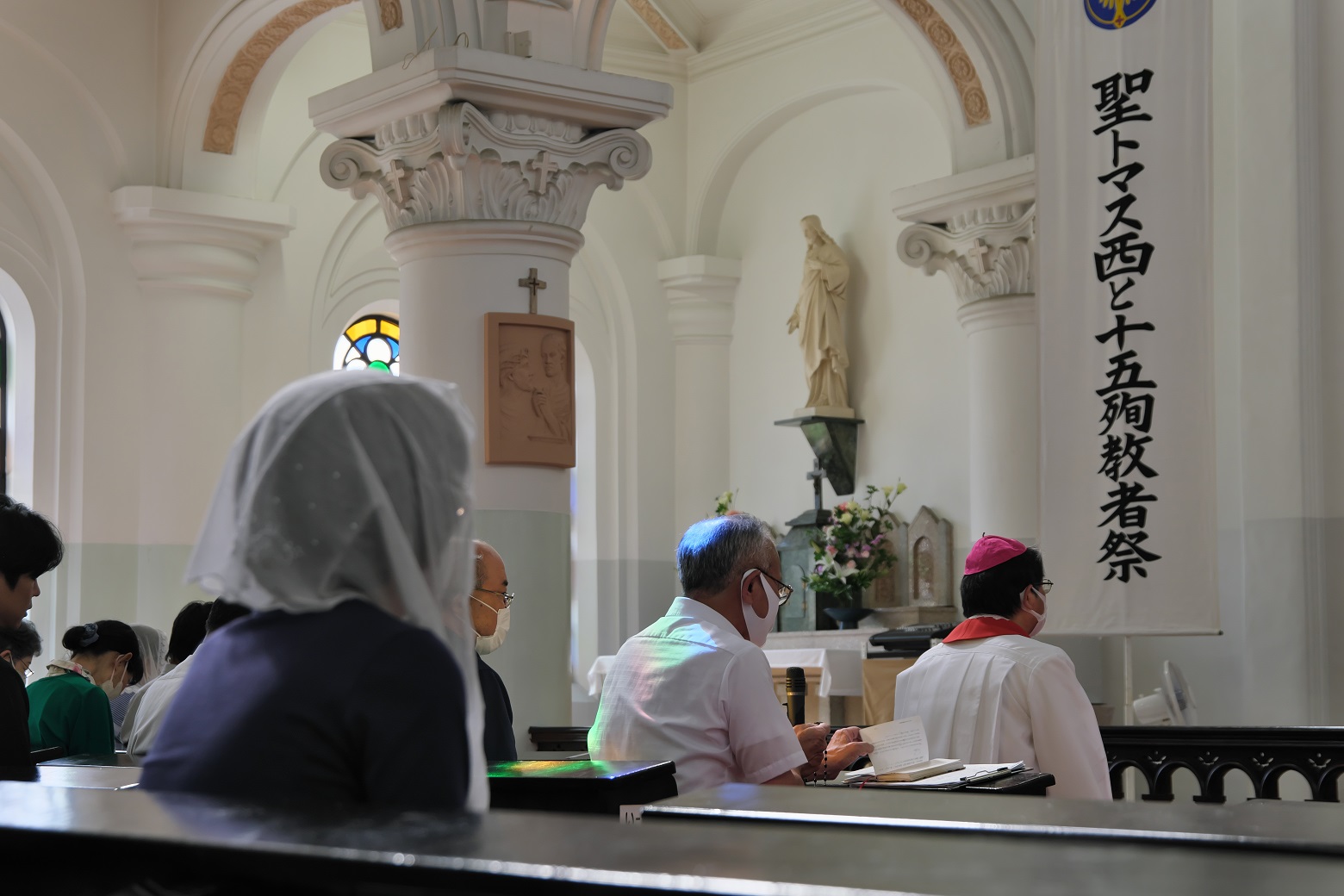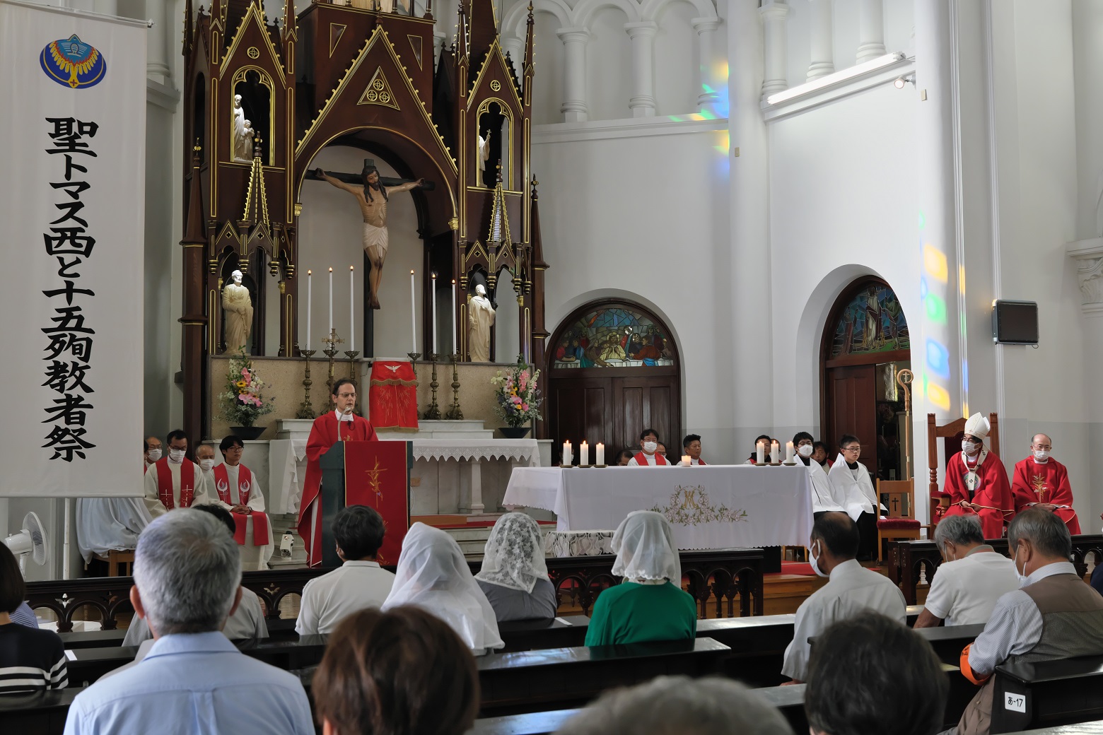 14時から教会敷地にある同殉教者記念庭園で中村倫明大司教が記念碑に献花・献香をし、皆で祈りをささげ、その後聖堂内に移動して「聖トマス西と十五殉教者の玄義によるロザリオの祈り」を唱えた。15時からの殉教記念ミサは、中村大司教が主司式を、22人の司祭団が共同司式を務め、集まった約220人の信徒らとともに皆で祈りをささげた。