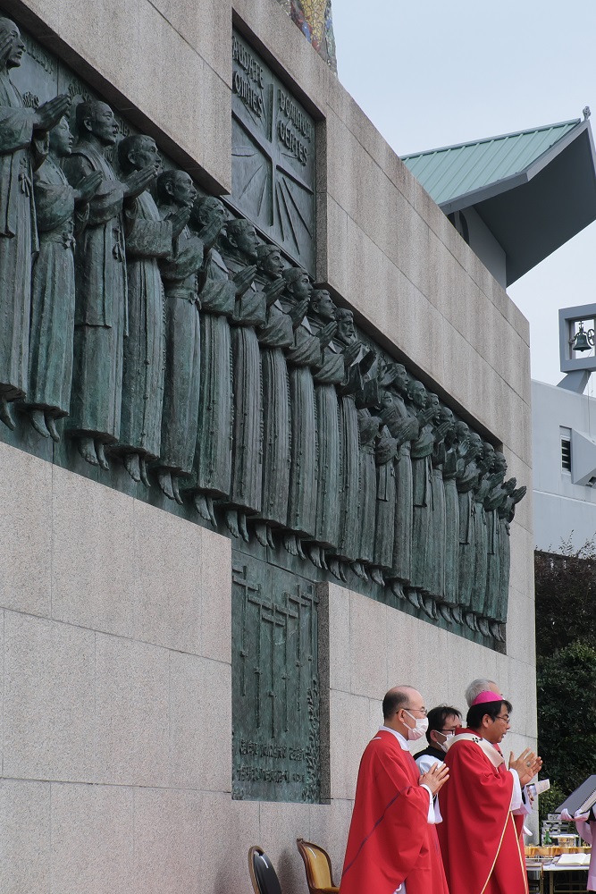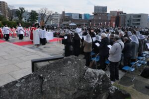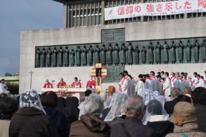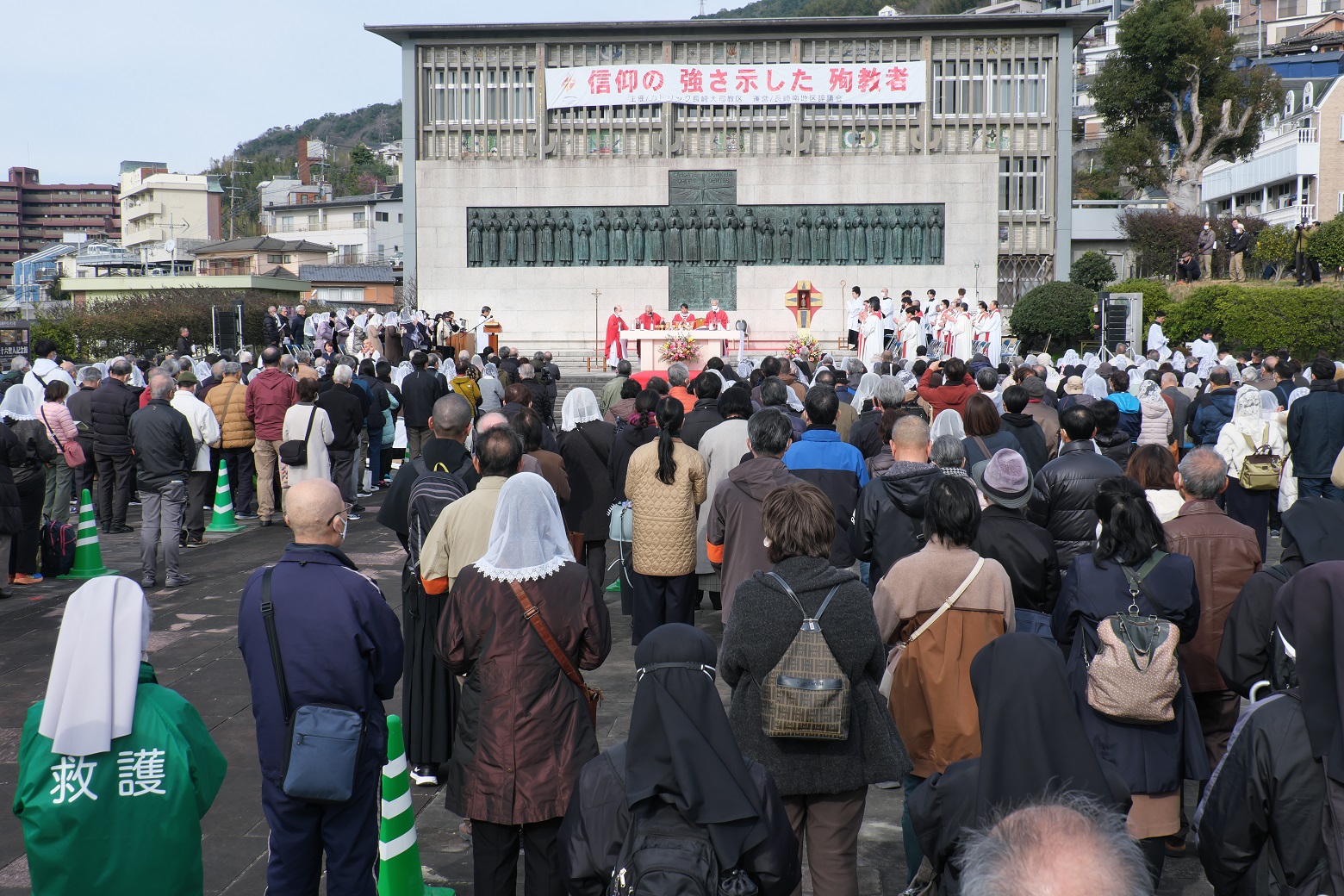 Blog日本二十六聖人殉教者の祝日である2月5日を前に、4日(日)14時から西坂公園で長崎大司教区主催、長崎南地区評議会担当による殉教記念ミサが行われた。ミサは中村倫明大司教の主司式、髙見三明名誉大司教と30人を超す司祭団の共同司式のもと、教区内外から集まった約1200人が殉教者を思い、共に祈りをささげた。