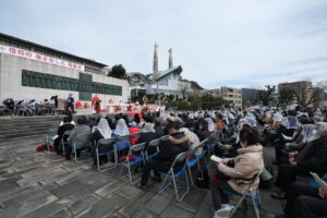 日本二十六聖人殉教者の祝日である2月5日を前に、4日(日)14時から西坂公園で長崎大司教区主催、長崎南地区評議会担当による殉教記念ミサが行われた。ミサは中村倫明大司教の主司式、髙見三明名誉大司教と30人を超す司祭団の共同司式のもと、教区内外から集まった約1200人が殉教者を思い、共に祈りをささげた。