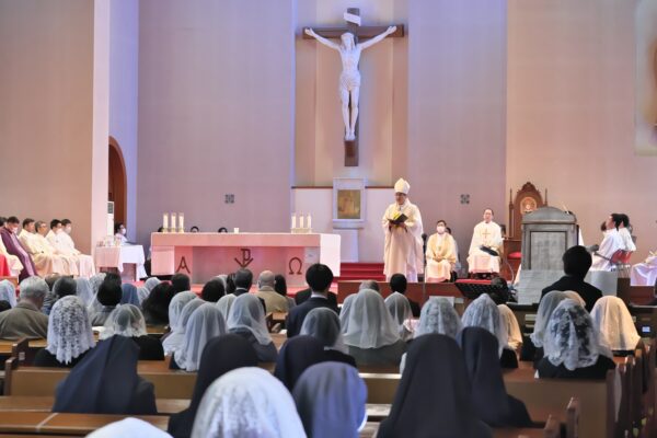 3月26日(火)10時30分から浦上司教座聖堂で中村倫明大司教の主司式、髙見三明名誉大司教と80人余の司祭団の共同司式により聖香油ミサが行われた。ミサには子どもたちを含め多くの信徒らが参加し、共に祈りをささげた。