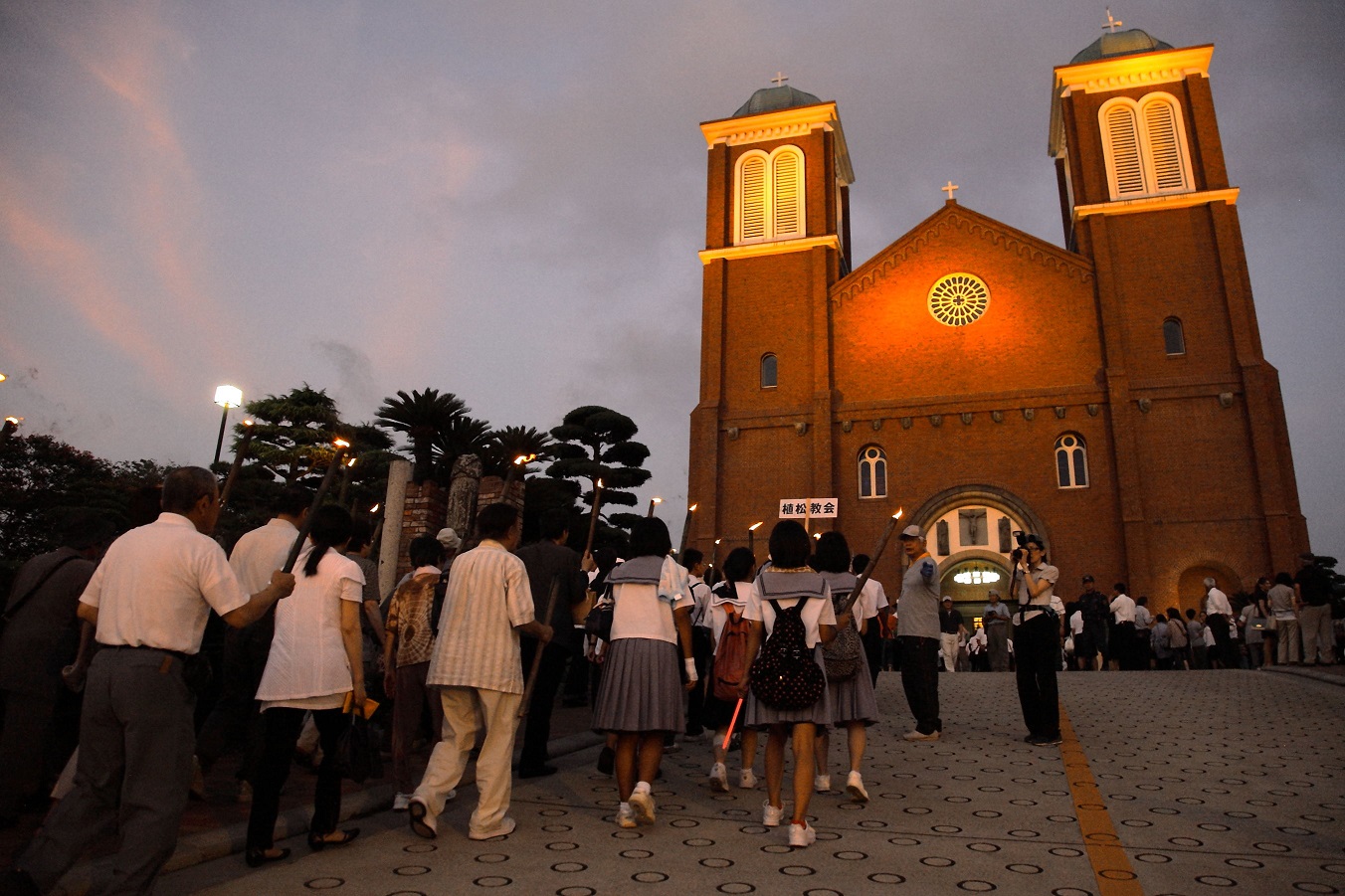 8月9日 平和祈願祭 Blog 2013.08.102013.08.28 8月9日、カトリック長崎大司教区は平和祈願祭(教区・同実行委員会主催)を行い、被爆マリアと共に、また多くの人々と共に、たいまつ行列とミサを通して平和の祈りをささげた。 浦上教会で行われたミサには、国内外からの巡礼団約130人を含む約1200人が集まった。 写真=被爆マリアと共に平和公園でのたいまつ行列出発式、浦上教会まで続く行列。