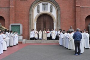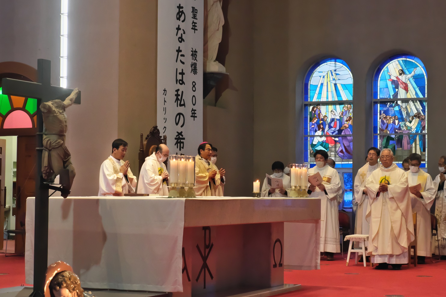 14時。参加者ははじめに浦上教会信徒会館に集い、中村倫明大司教の招きの言葉によって聖歌を歌いながら巡礼行列をし、聖堂正面の扉の前に集まった。その後、大司教によって司教座聖堂の扉が開かれ、司教・司祭団、修道者や信徒たち多くの人々が扉から入堂。入堂後は皆が見守る中で被爆十字架の開示、被爆十字架と祭壇への献香、聖水による灌水が行われ、美しい聖歌の歌声が響く中、大きな希望のうちに祈りがささげられた。