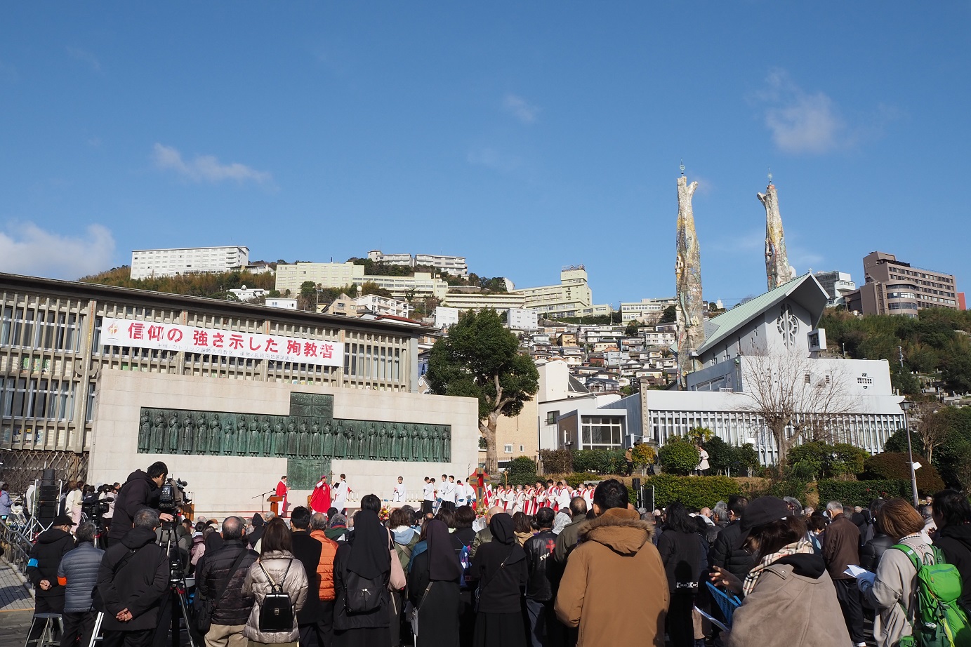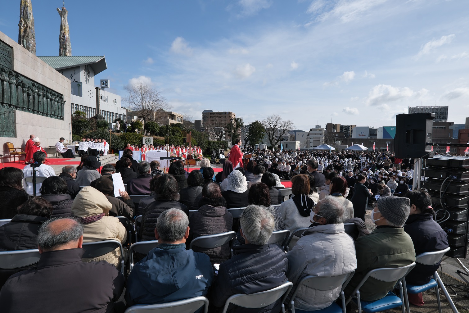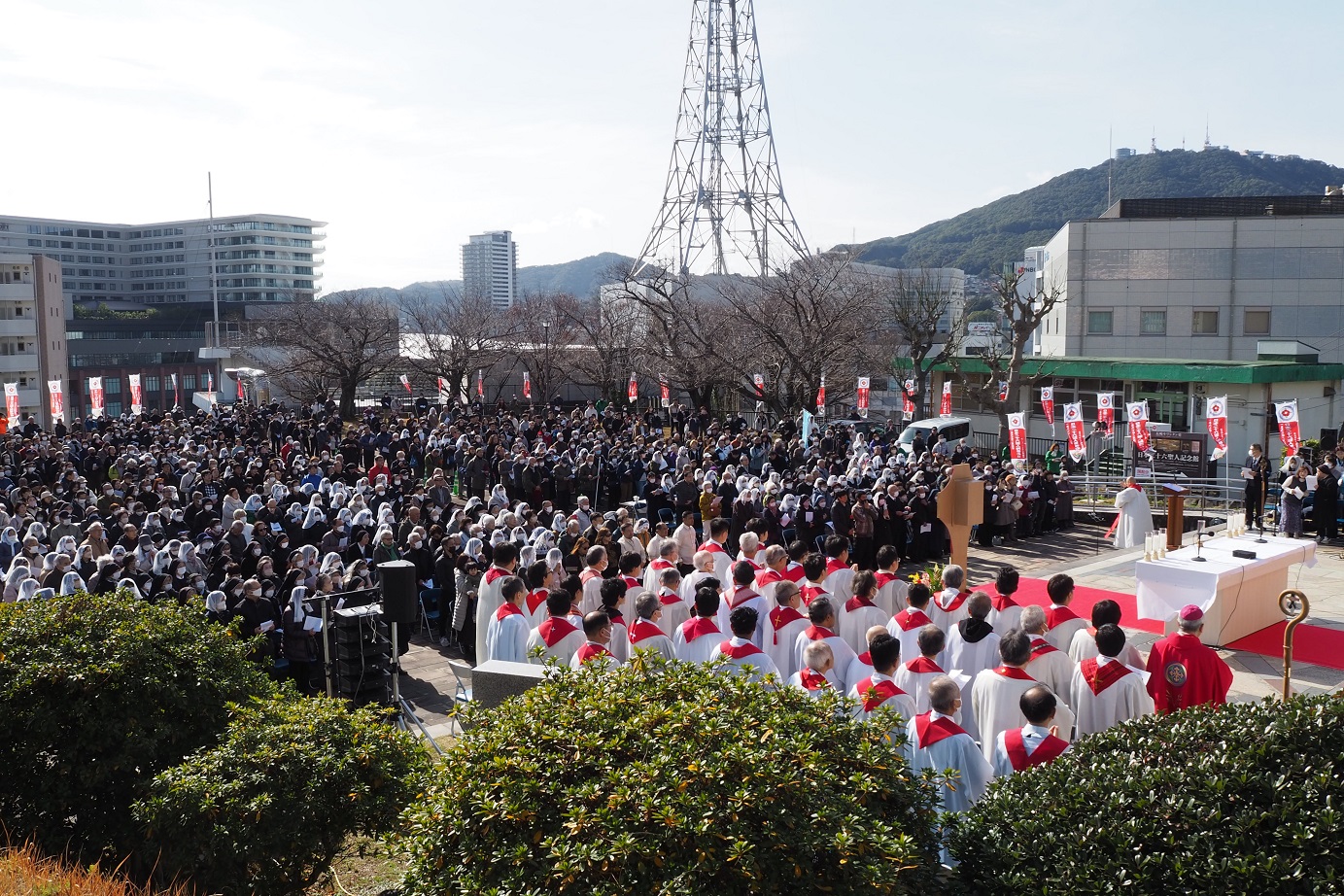 日本の教会は2月5日を、日本二十六聖人殉教者(聖パウロ三木と同志殉教者)の祝日として記念している。この日を前に2月2日(日)、長崎大司教区は14時から西坂公園で殉教記念ミサを行った。中村倫明大司教が主司式を務め、髙見三明名誉大司教と約50人の司祭団が共同司式をし、各地から集まった約1500人が殉教者を思い、祈りをささげた。(写真はミサの様子)