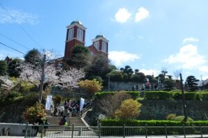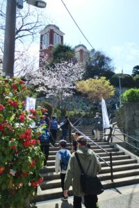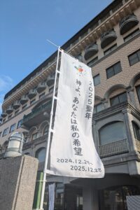 (写真は順番に、集いを締めくくるミサの様子。大司教館前に掲げられた2025聖年にあたっての長崎教区ののぼり、如己堂、浦上教会下の被爆鐘楼、被爆した聖人像などの前で説明を聞く参加者、被爆マリア小聖堂、浦上教会へ上る参加者、ミサ前に多くの参加者が集まってきた様子)