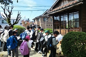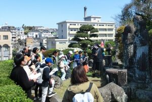 参加者は、平和公園と浦上教会の二手に分かれ「キーワード探し」をスタート。浦上教会の祭壇や被爆マリア小聖堂、教会敷地と周辺の被爆遺構、浦上四番崩れによる流配の記念碑、信徒発見150周年記念のレリーフ、如己堂など計10カ所を約2時間かけて徒歩で巡礼し、各場所で説明を聞いて学び、キーワードを受け取って10文字の言葉を完成させた。