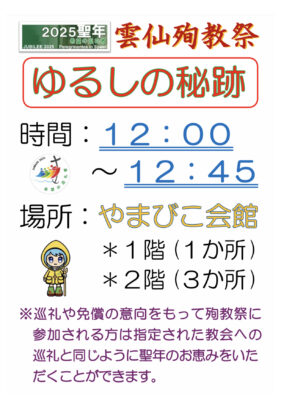 今年も、雲仙殉教祭が以下の通り行われる予定です。2025聖年にあたり、殉教記念ミサの前にゆるしの秘跡を受けることができます(場所は「雲仙メモリアルホール」の手前にある「やまびこ会館」)ので、お知らせいたします。