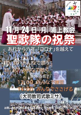 …11月24日といえば、前教皇フランシスコの長崎での訪日ミサからちょうど6年になります。その時には、子どもたちを含め1200人が聖歌隊として集まり、ビッグNスタジアムで力強い賛美の奉仕をしていただきました。あの時の感動と熱意を再びということで、当時の聖歌隊参加者や聖歌に関心のある方々に参加を呼びかけたい。