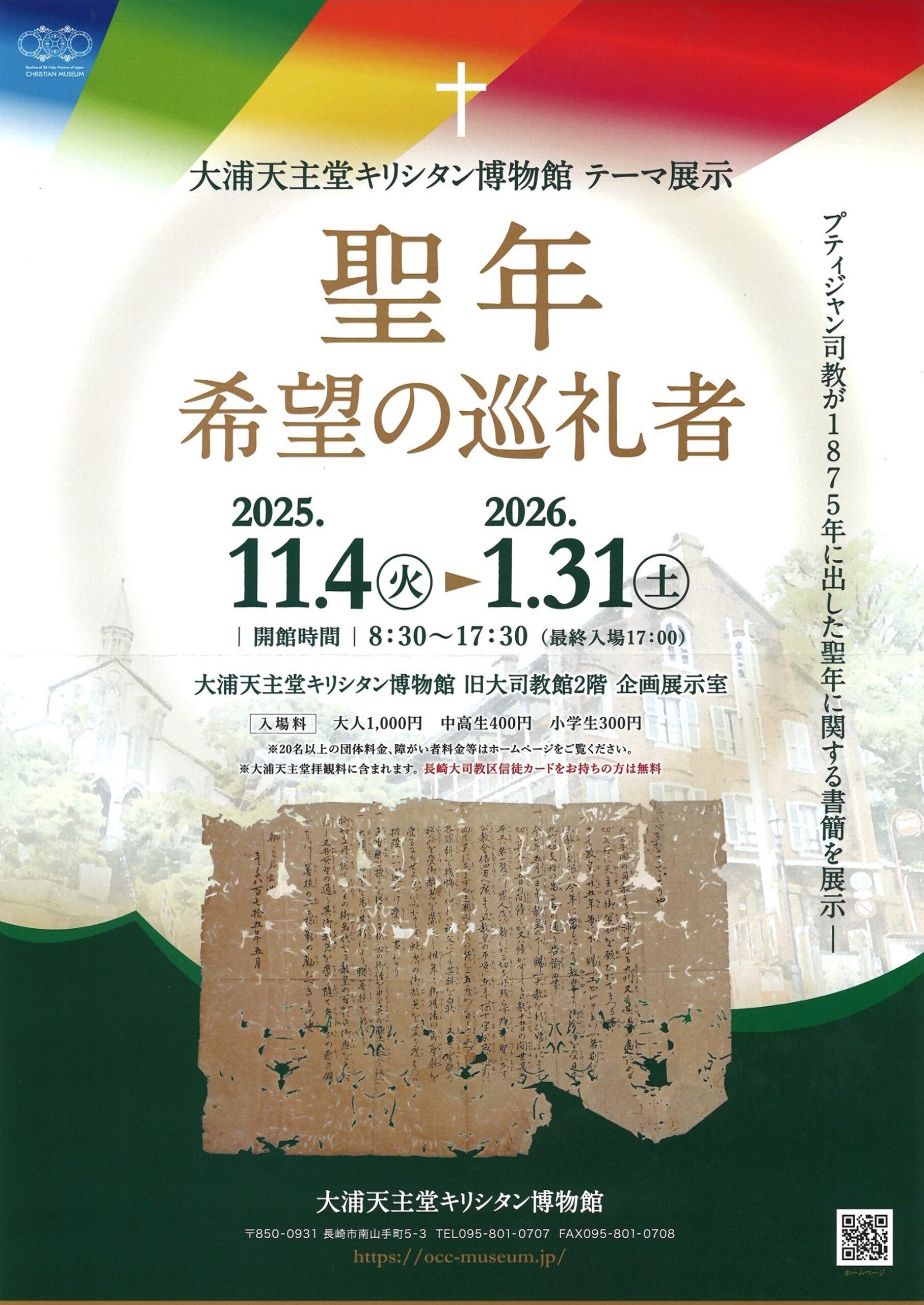 現在、大浦天主堂キリシタン博物館でテーマ展示「聖年 希望の巡礼者」が開催中です。各小教区にはすでにご案内があっていると思いますが、あらためてお知らせいたします。