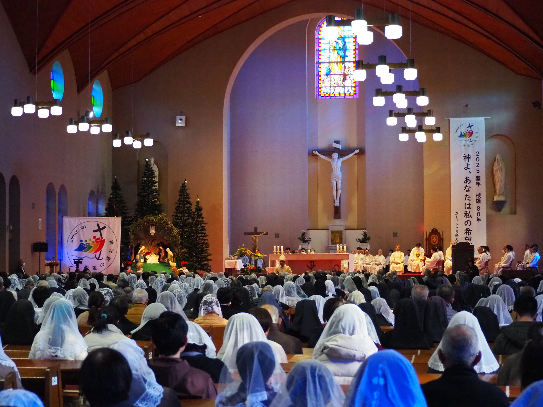長崎教区においては12月28日(日)14時から司教座聖堂である浦上教会で聖年閉幕ミサが行われ、中村倫明大司教の主司式、約50人の司祭団の共同司式のもと、聖歌隊を含む約800人の信徒らが参加し、聖年の恵みをいただいた感謝のうちにともに祈った。ミサの終わりには、聖年期間中に教区が呼びかけた平和作文コンクールの表彰式と、教区で作成した新しい祈祷書の使用開始式があった。