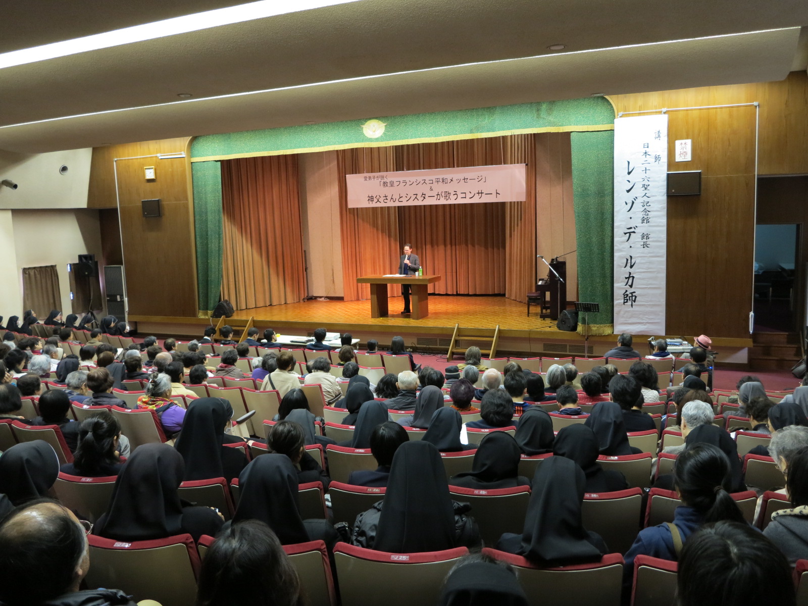 3月2日 「教皇フランシスコ平和メッセージ」&神父さんとシスターが歌うコンサート Blog 2014.03.03 3月2日(日)カトリックセンターホールで、「『教皇フランシスコ平和メッセージ』&神父さんとシスターが歌うコンサート」(カトリック長崎大司教区平和推進委員会主催)が行われた。 集いでは、日本二十六聖人記念館館長レンゾ・デ・ルカ師による、教皇フランシスコ世界平和の日メッセージについての解説、また、神父やシスターがたによる歌の演奏、そして、昨年の沖縄平和学習に参加した高校生の皆さんから活動報告があり、約350人の参加者は講演・報告や演奏などを熱心に聴き入った。