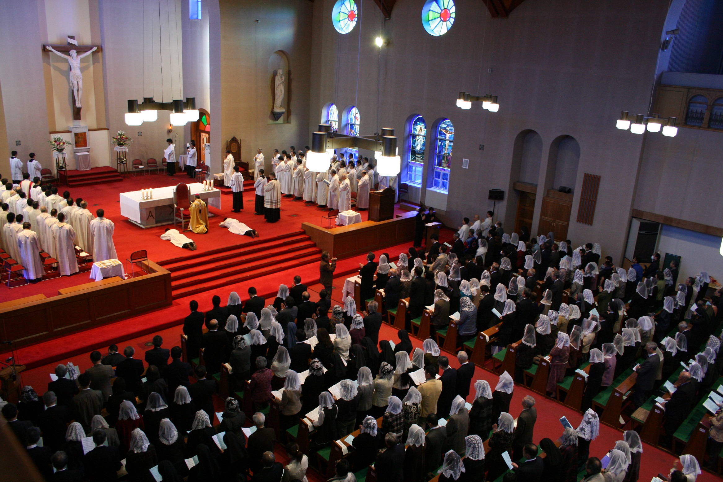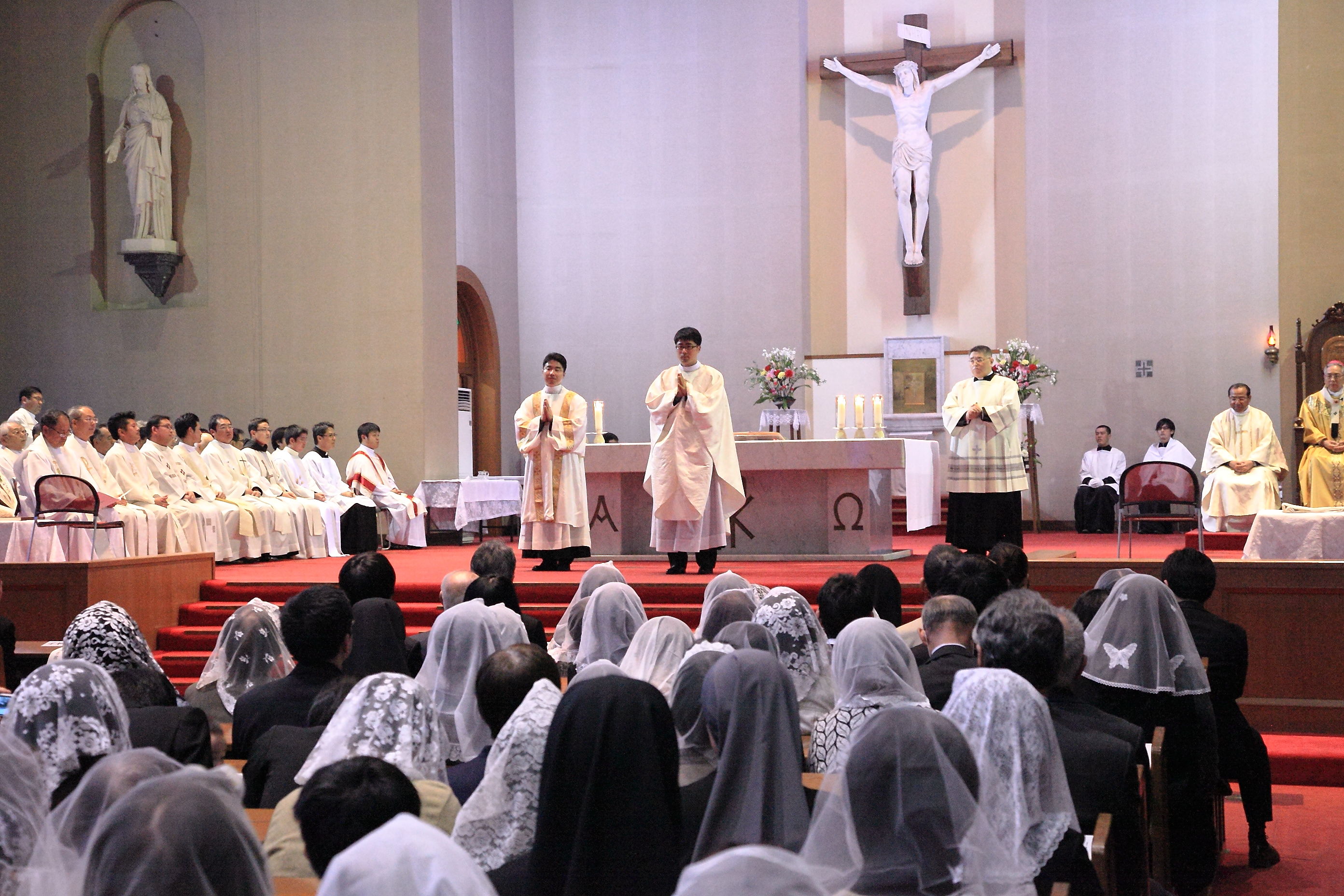 3月21日 叙階式 Blog 2014.03.222014.06.11 3月21日(金)16時からカトリック浦上教会で、司祭・助祭叙階式が髙見三明大司教主司式により執り行われた。新司祭は滑石教会出身の川端志範師、新助祭は諫早教会出身の稲田伸也師。司祭・助祭団100人余りと多くの修道者、信徒らが見守る中、式が進められ、聖堂は新司祭、新助祭を迎える感謝と喜びにあふれた。 写真は、諸聖人の連願と、叙階された川端新司祭(中央)と稲田新助祭(左)。