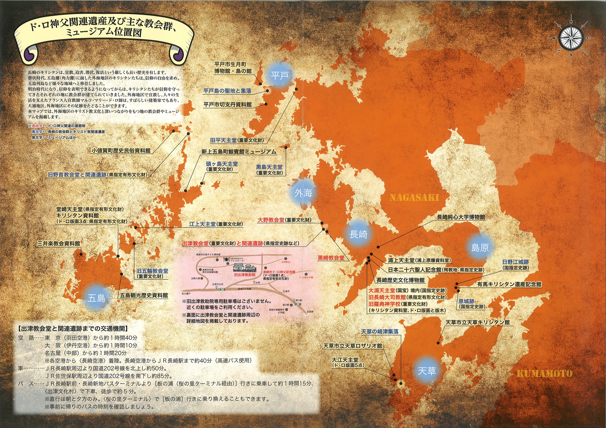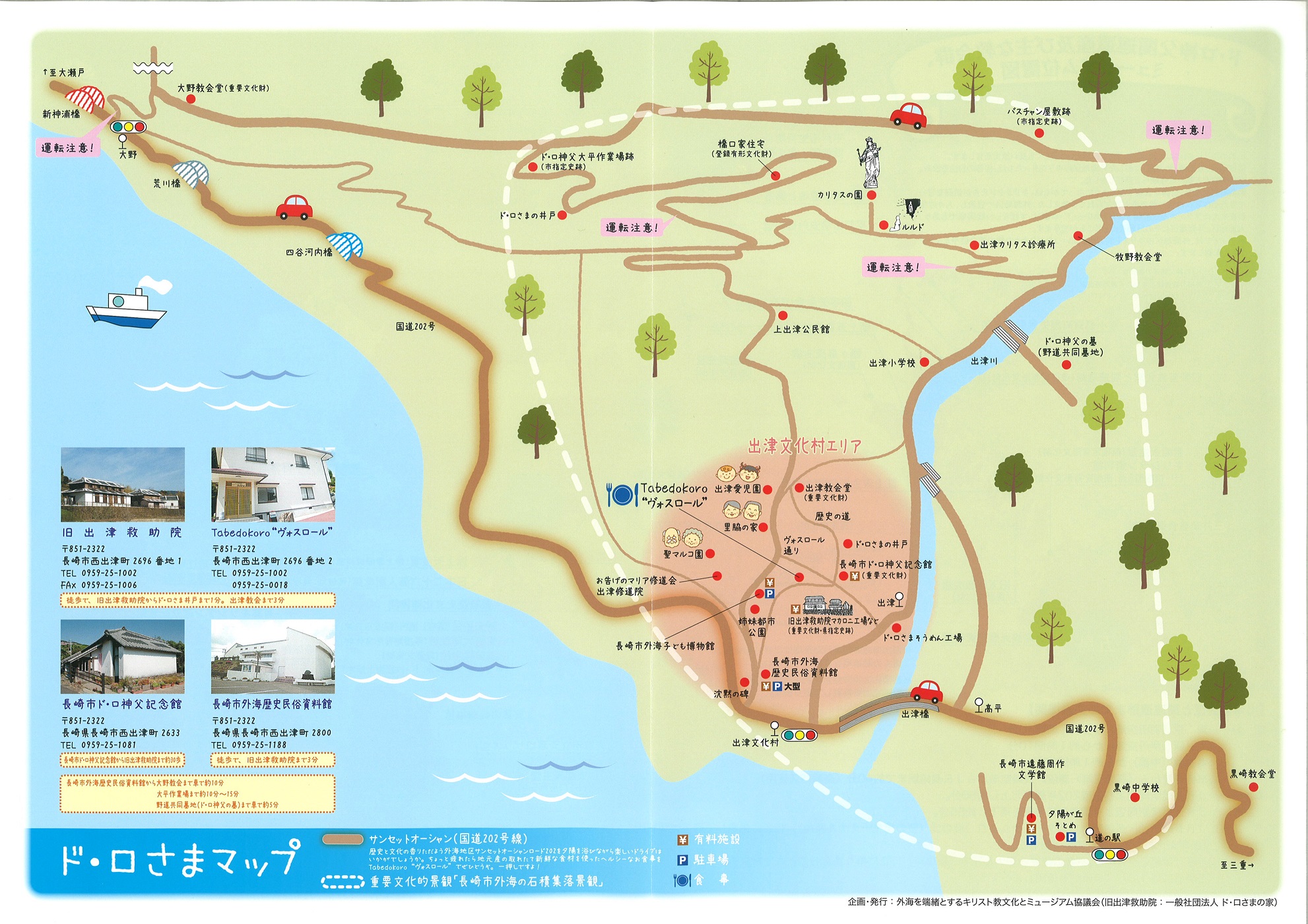 (ド・ロさまマップの紹介)企画・発行・・・外海を端緒とするキリスト教文化とミュージアム協議会(旧出津救助院:一般社団法人 ド・ロさまの家) Blog 2014.06.092014.06.16 「長崎のキリシタンは、宣教、迫害、潜伏、復活という厳しくも長い歴史を有します。・・・(中略)・・・外海地区で宣教し、人々の生活を支えたフランス人宣教師マルコ・マリー・ド・ロ師は、すばらしい建築家でもあり、大浦地区、外海地区にその足跡をたどることができます。本マップでは、外海地区のキリスト教文化と深いつながりをもつ地の教会群やミュージアムを掲載します。」〔ド・ロさまマップより抜粋〕