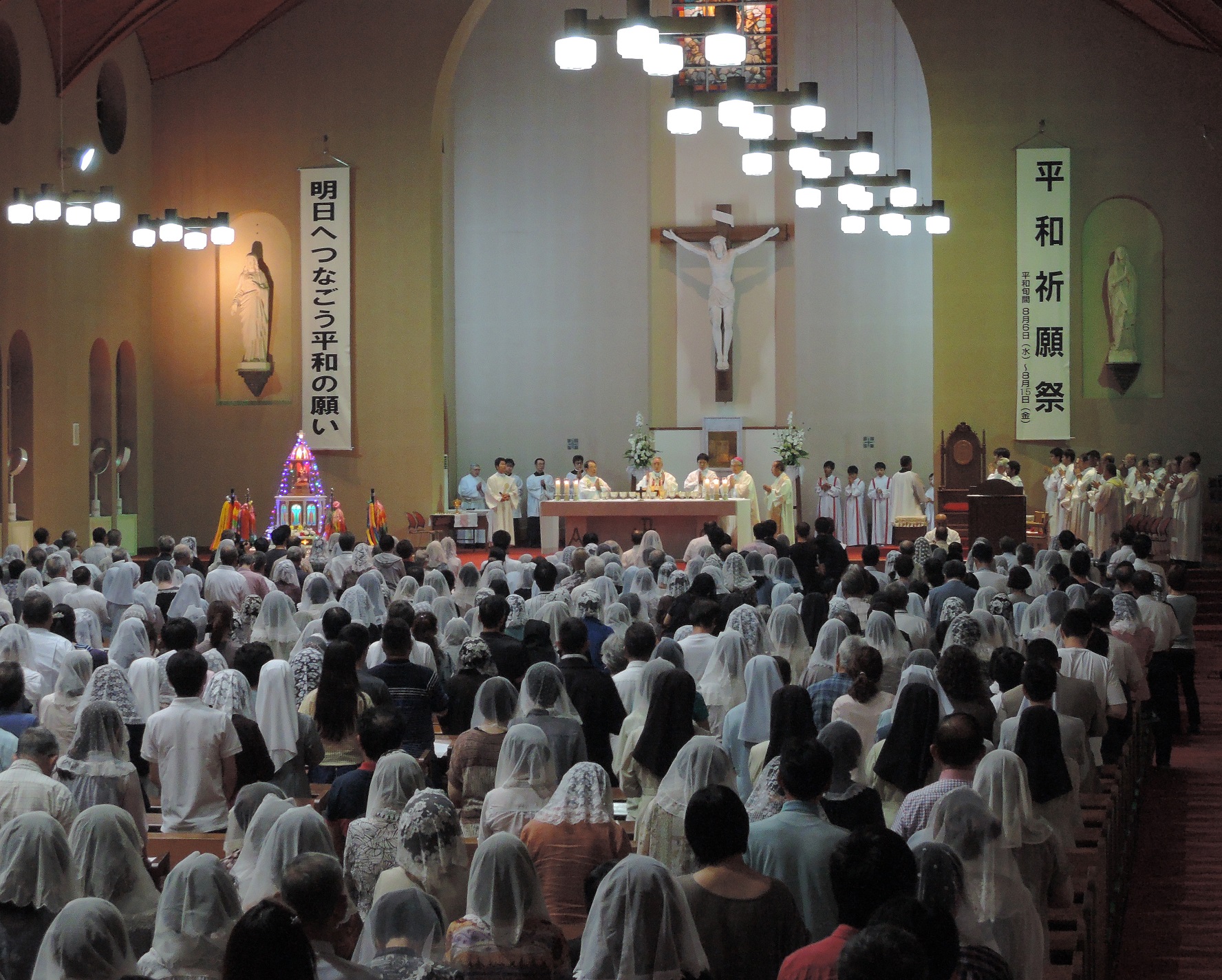 集まった約1,000人の信者らは、被爆マリアと共に、世界平和とすべての戦争犠牲者のために祈りをささげた。