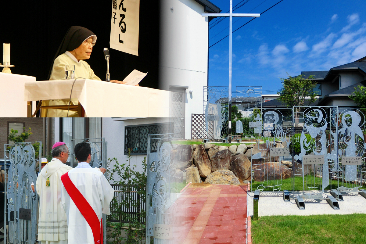 (写真は、殉教記念ミサ、講演する片岡千鶴子シスター、放虎原殉教地に設置された十六聖人のモニュメントと髙見三明大司教による祝福)