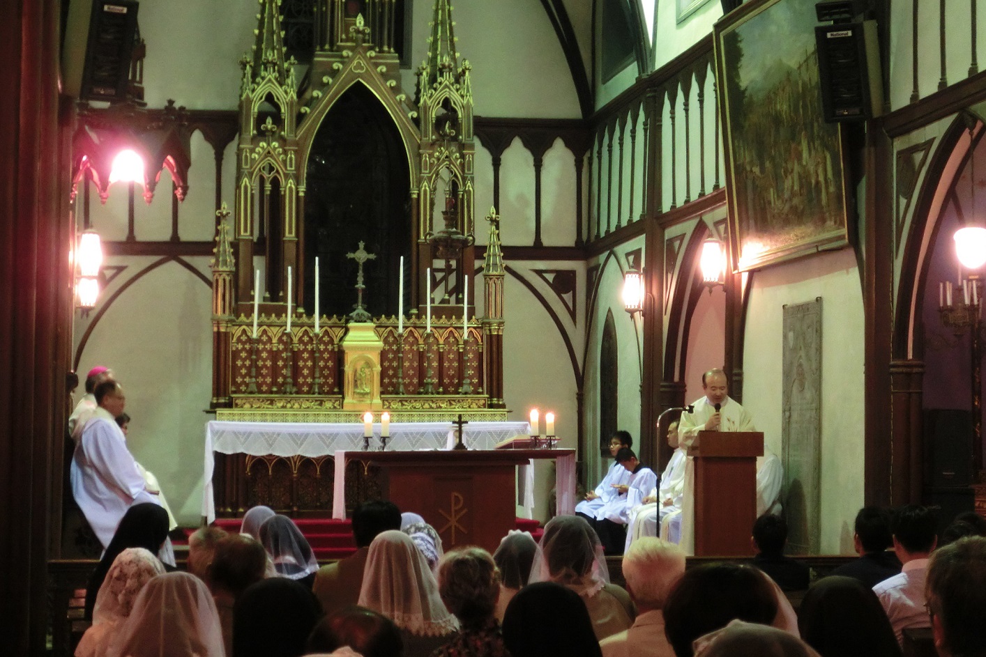 10月24日(金)19時から大浦天主堂で第14回召命祈願ミサが行われた。髙見三明大司教主司式、13人の司祭が共同司式を務め、司祭・修道者を志す神学生・志願生のため、また新たな召命の恵みを願って、集まった神学生・志願生、信者ら皆で祈りをささげた。ミサに先立ち神学生から案内の言葉があり、参加者は祈ることの大切さをあらためて感じながらの入祭となった。