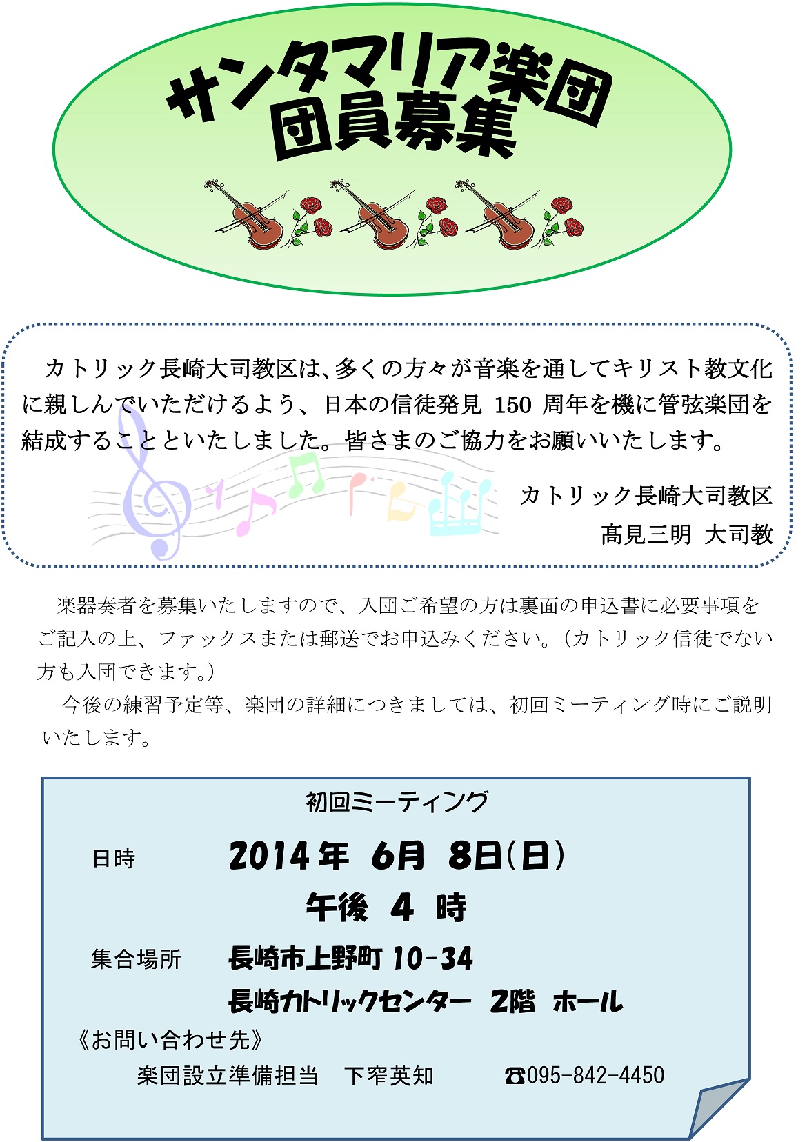 《申込書送付先》 ファックス: 095-842-4460 郵送: 〒852-8113 長崎市上野町10-34 カトリックセンター内 楽団設立準備担当