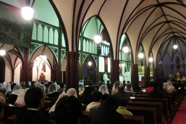 1月23日 第15回召命祈願ミサ Blog 2015.01.24 1月23日(金)19時から大浦天主堂で第15回召命祈願ミサが行われ、髙見三明大司教主司式、司祭団10人余の共同司式のもと、参列者皆が心を合わせ祈りをささげた。 長崎コレジオと長崎カトリック神学院が合同で行うこのミサは2010年に始まり、毎回、教区・修道会の神学生と志願生、また、多くの信者らが参列し、召命のための祈りをささげている。長崎コレジオは今年2月に閉校する(コレジオ新入生は『福岡コレジオ』で学ぶ)が、今後も長崎カトリック神学院が中心になって祈願ミサが行われる。