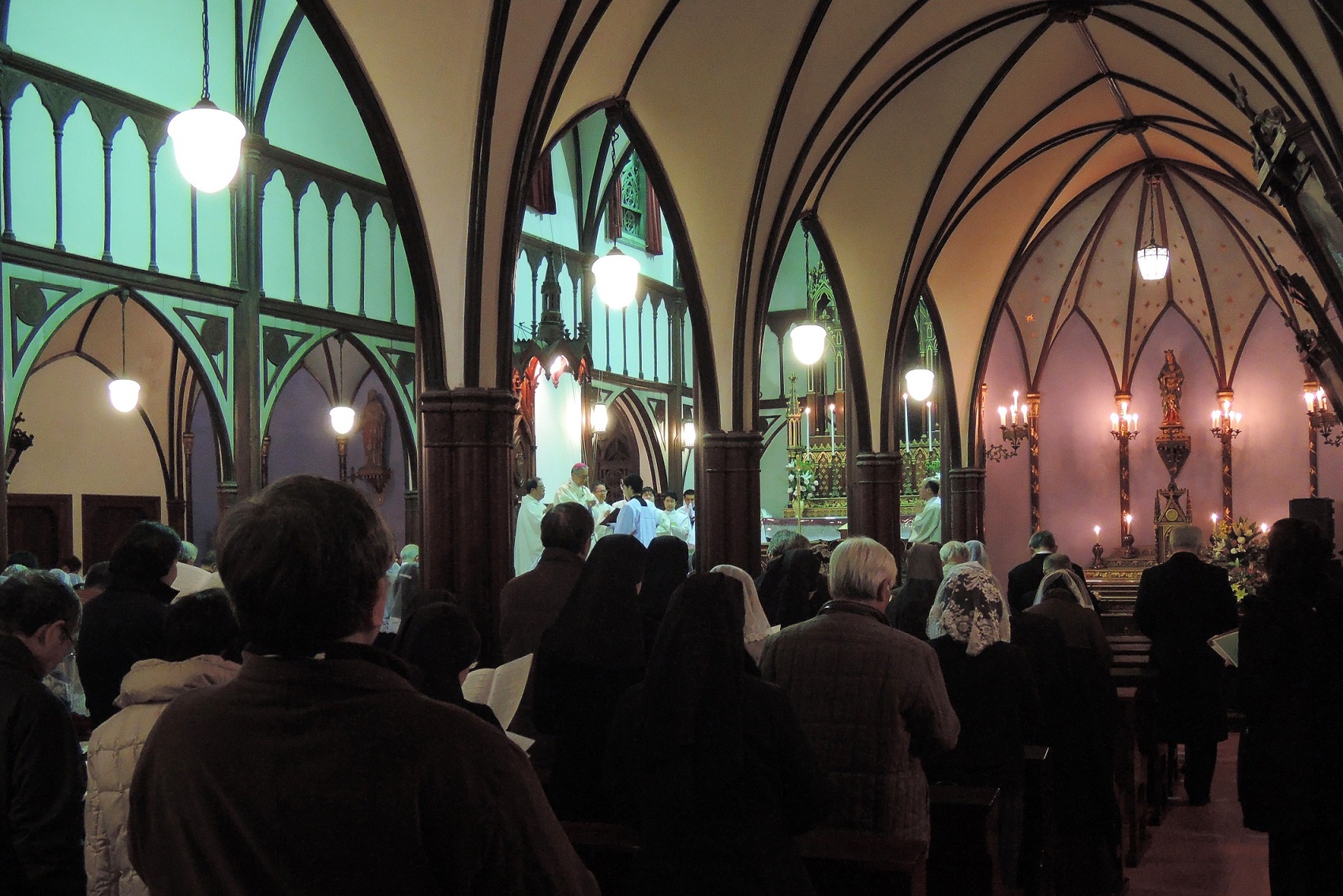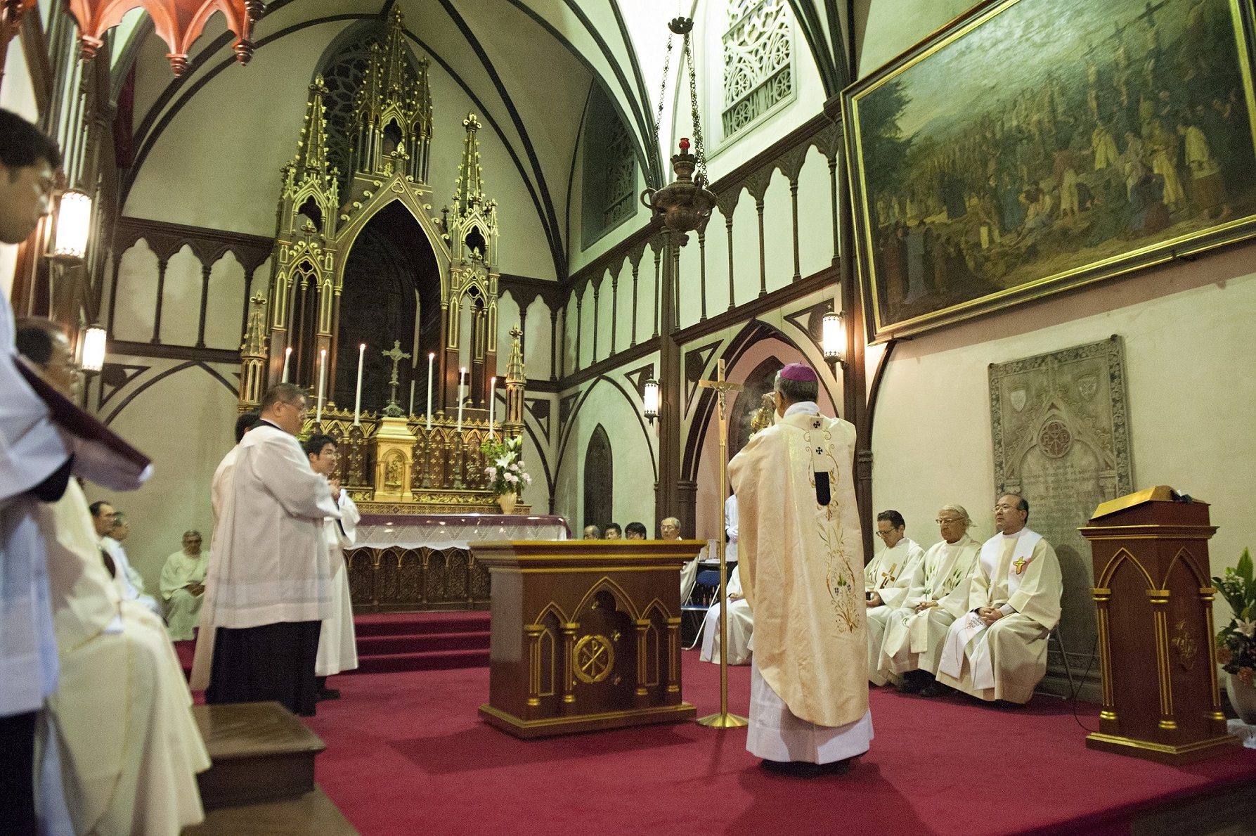 2月19日(木)19時から大浦天主堂で献堂150周年を記念するミサが行われ、髙見三明大司教主司式、司祭団20人余の共同司式のもと約200人が共に祈った。