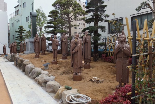 聖トマス西と十五殉教者記念庭園 聖人像の設置が終了 Blog 2015.02.27 かねてより日本の信徒発見150周年記念事業の一環として準備が進められてきた聖トマス西と十五殉教者記念庭園(カトリック中町教会内)の聖人像が、2月26日から27日にかけて設置された。 3月に入ってからは芝生の養生などが行われる。記念庭園の祝福式は3月16日(月)17時から。祝福式の前には16時から片岡千鶴子修道女による記念講演が中町教会聖堂で行われる。(写真: 整備が進む記念庭園。2月26日撮影)