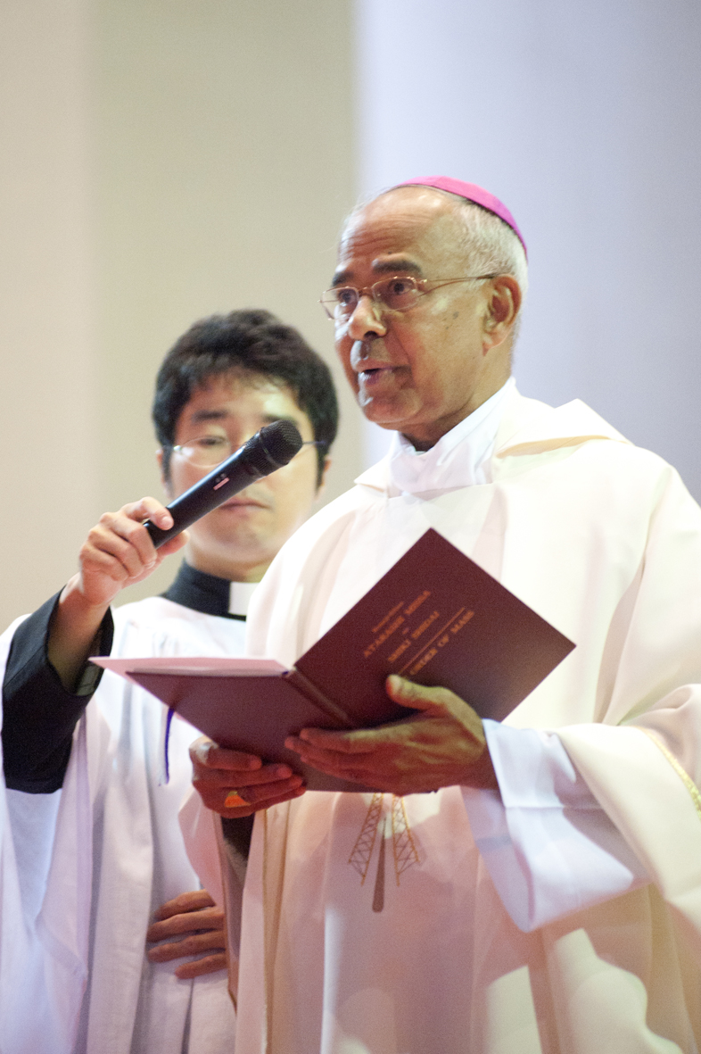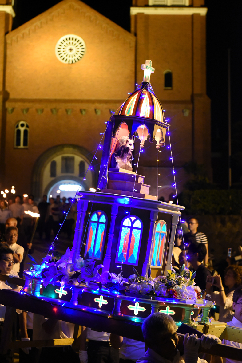 ミサ後、浦上の被爆マリア像と共に平和公園に向けてたいまつ行列があり、公園到着後、みことばの祭儀へと続いた。そして、武力によらない、愛による平和の実現を願って 『広島・長崎キリスト者共同平和アピール』 が藤井清邦牧師(古町教会・長崎キリスト教協議会議長)と髙見三明大司教によって読み上げられた。最後にアシジの聖フランシスコの『平和を求める祈り』を皆で唱え、平和を築く決意を新たにした。