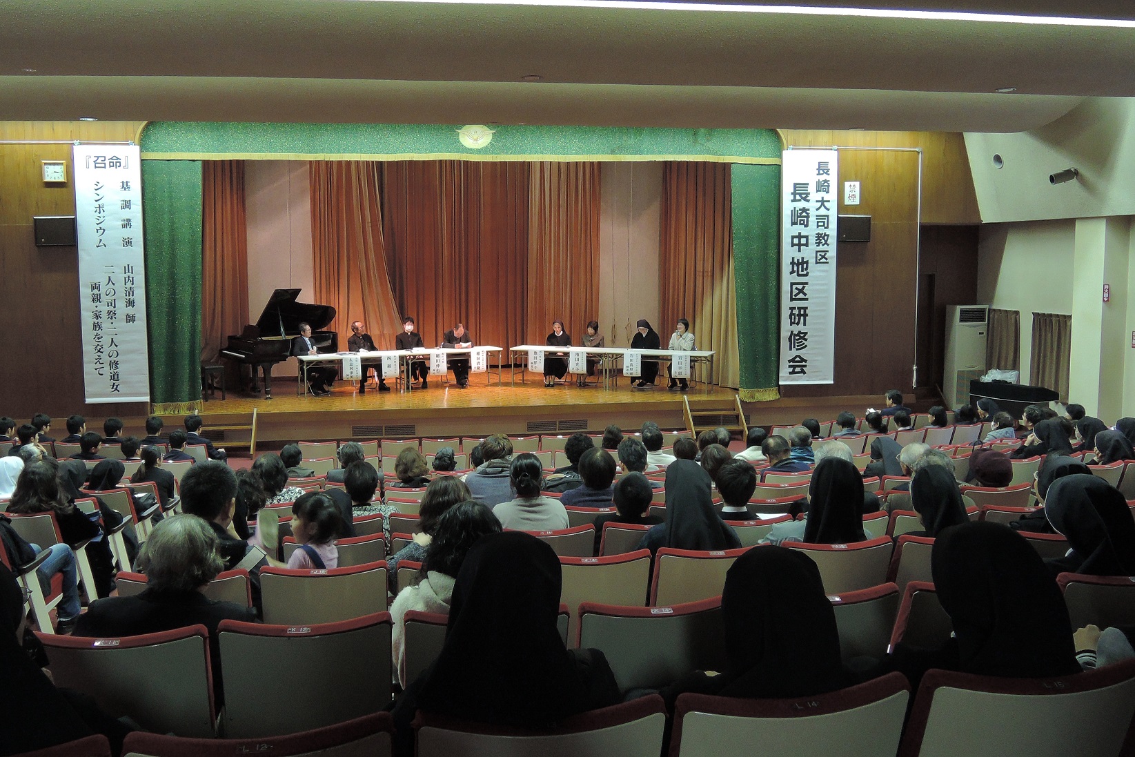 第1部は山内清海師(お告げのマリア修道会付)が基調講演をし、第2部のシンポジウムでは、2人の司祭、2人の修道女、その家族の皆さんが登壇し、話が進められた。司祭・修道女を目指した動機、学生の頃や今現在どのように感じているか、また、子を思う親の立場からの話など、参加者は熱心に聴き入り、質疑応答もあった。