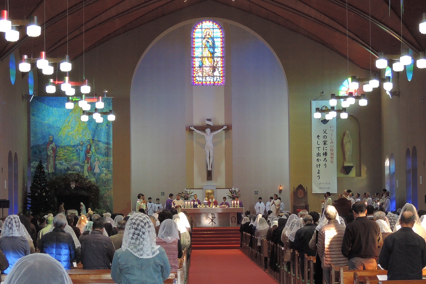 この日、ほか6つの地区長教会(中町・滑石・相浦・平戸ザビエル記念・青方・福江)と、大浦教会、聖フィリッポ教会(日本カトリック長崎・西坂巡礼所)の「いつくしみの扉」も開かれた。特別聖年にあたり、これら合わせて9つの教会は長崎教区の巡礼指定教会とされた。 (写真は浦上司教座聖堂でのミサ)