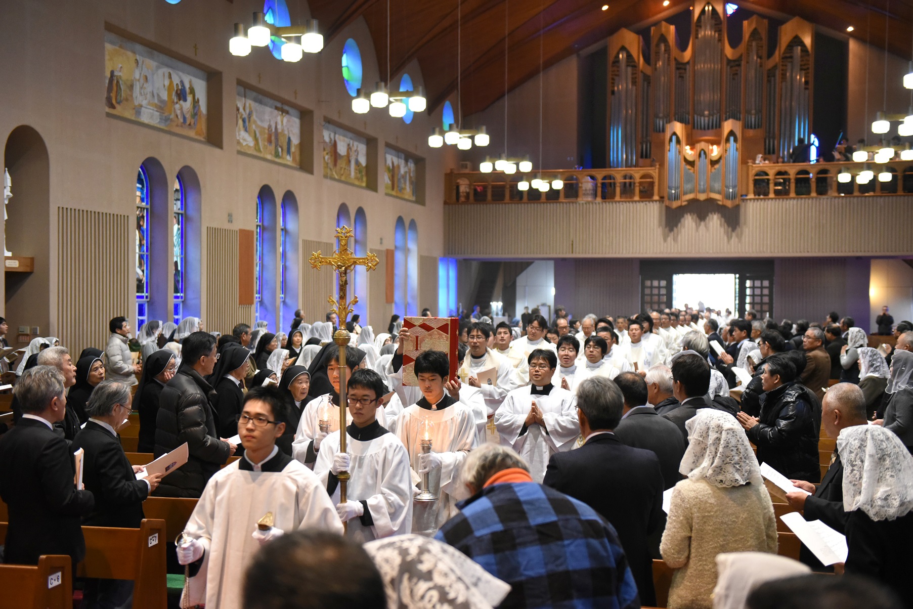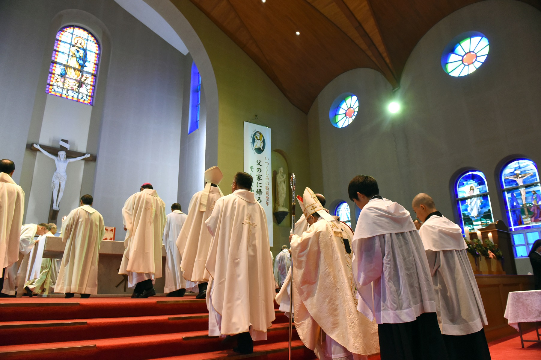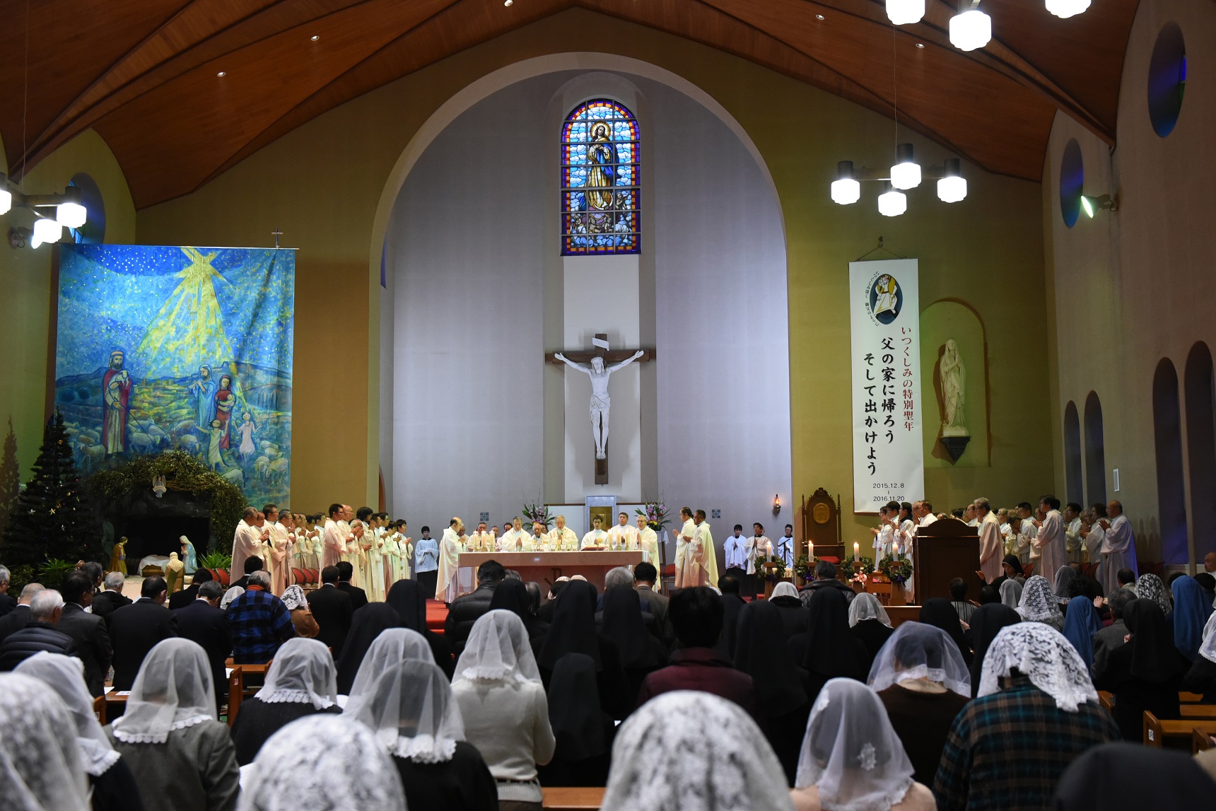 12月20日 長崎神学校創立150周年記念ミサ Blog 2015.12.21 12月20日(日)16時から浦上教会で長崎神学校創立150周年記念ミサが行われ、髙見三明大司教主司式、前田万葉大司教(大阪)、浜口末男司教(大分)、宮原良治司教(福岡)参列のもと、司祭・助祭80人余りを含めた約400人の信者が共に祈った。 日本の信徒発見150周年の締めくくりともいえるこのミサの中で、150年前、長崎の地に無原罪の聖母マリアを保護者とする神学校が創立されたことを感謝するとともに、その後の神学校の歩み、かかわったすべての人、それぞれの召命をあらためて思い起こし、祈りをささげた。