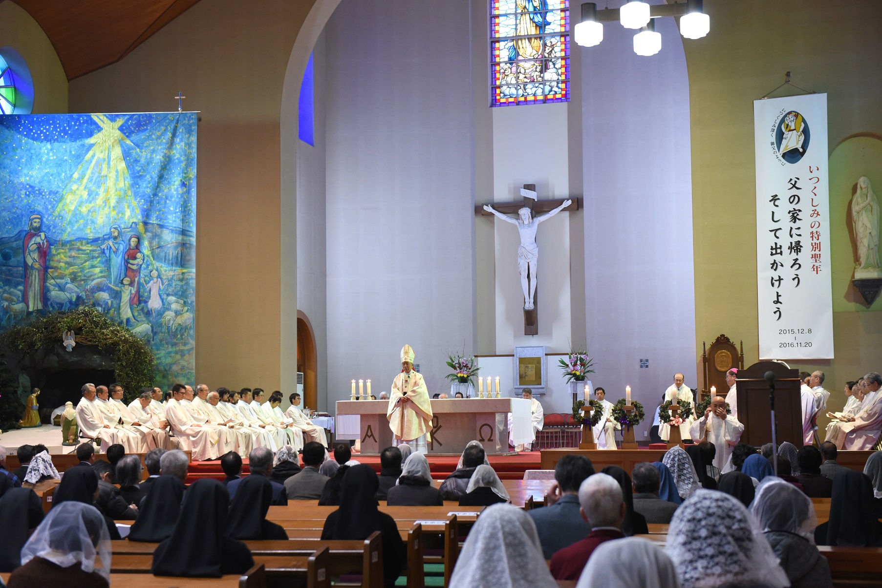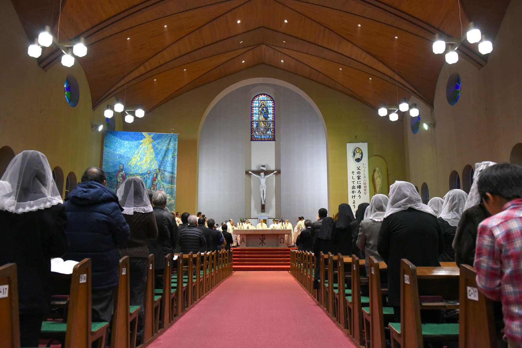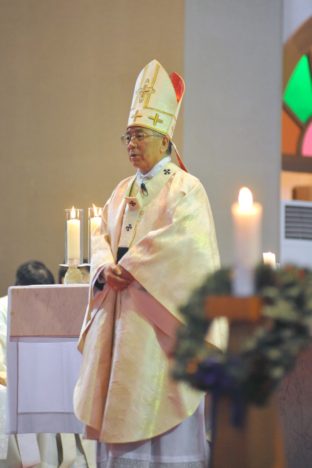 12月20日 長崎神学校創立150周年記念ミサ Blog 2015.12.21 12月20日(日)16時から浦上教会で長崎神学校創立150周年記念ミサが行われ、髙見三明大司教主司式、前田万葉大司教(大阪)、浜口末男司教(大分)、宮原良治司教(福岡)参列のもと、司祭・助祭80人余りを含めた約400人の信者が共に祈った。 日本の信徒発見150周年の締めくくりともいえるこのミサの中で、150年前、長崎の地に無原罪の聖母マリアを保護者とする神学校が創立されたことを感謝するとともに、その後の神学校の歩み、かかわったすべての人、それぞれの召命をあらためて思い起こし、祈りをささげた。