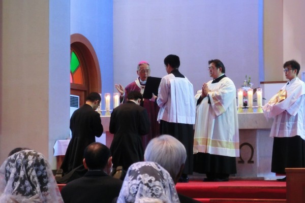 2月28日 助祭・司祭候補者認定式 Blog 2016.02.29 2月28日(日)15時から浦上教会で助祭・司祭候補者認定式が行われ、司祭・修道者・信徒らが見守る中、2人の神学生が長崎教区の助祭・司祭候補者として認定された。 司式した髙見三明大司教は、この日認定された、司祭を目指す神学生とその家族のため、また、3月に行われる選任式と叙階式に向けてもさらなる祈りを呼び掛けた。 ※ 祭壇奉仕者・朗読奉仕者選任式は3月10日(木)13時から、司祭・助祭叙階式は3月13日(日)15時から、いずれも浦上教会で行われる。