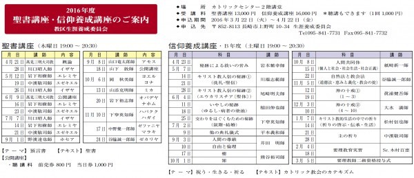 2016年度の聖書講座では「預言書」を取り上げ、大司教様をはじめ多数の神父様に解説をしていただきます。また信仰養成講座では、テーマを「祝う・生きる・祈る」として『カトリック教会のカテキズム』第2編から第4編を学びます。教区シノドスの提言を具体的に生きる一つの方法として、一人でも多くの方々が聖書に親しみ、復活された主に出会い、その喜びを伝えられることを願っています。