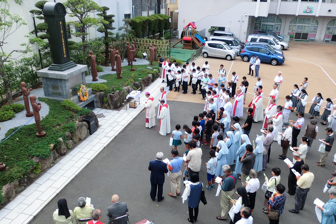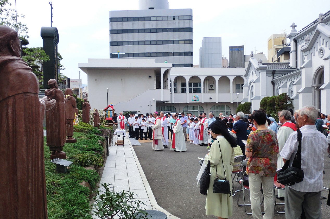 始めに同殉教者記念庭園に参加者が集まり、聖歌が歌われる中、髙見三明大司教が顕彰碑に献花、十六聖人像に献香をした。続いて皆でロザリオの祈りをささげ、祈りを唱えながら聖堂内へと移動した。記念ミサは髙見大司教主司式、19人の司祭団の共同司式のもと、多くの子どもたちが典礼奉仕に参加して行われた。