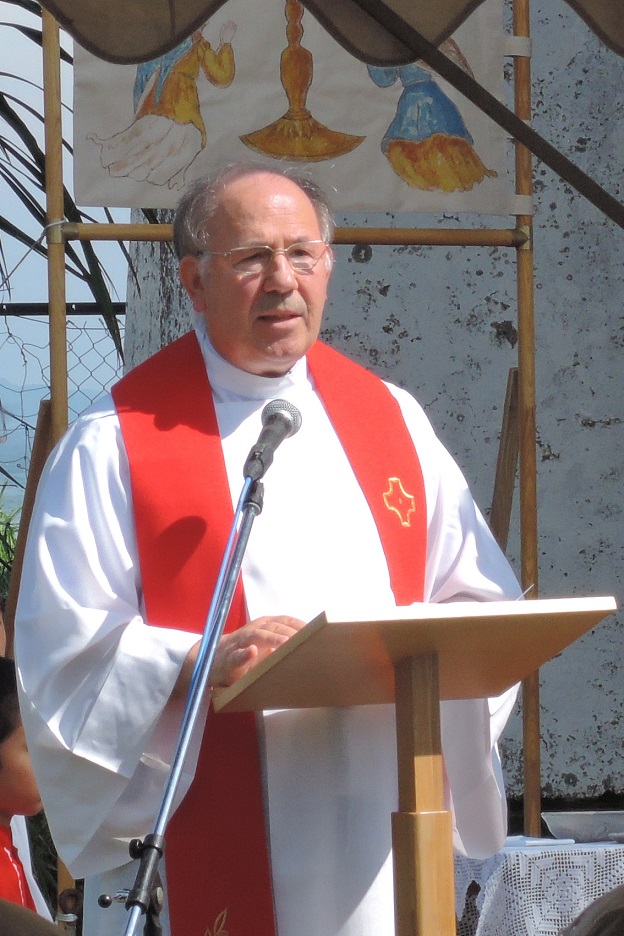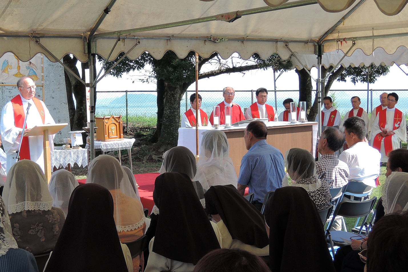 10月9日 島原・天草殉教福者記念ミサ Blog 2016.10.112016.10.20 10月9日(日)13時から原城本丸跡で島原・天草の殉教福者らを記念するミサが行われた。今年のテーマは、「いつくしみ深い神をたたえよう 殉教者とともに」。主催する島原教会の主任司祭・山田良秋神父が主司式をつとめ、8人の司祭の共同司式のもと、祈りがささげられた。 写真は、説教するサレジオ修道会のソボン・タデウス神父。