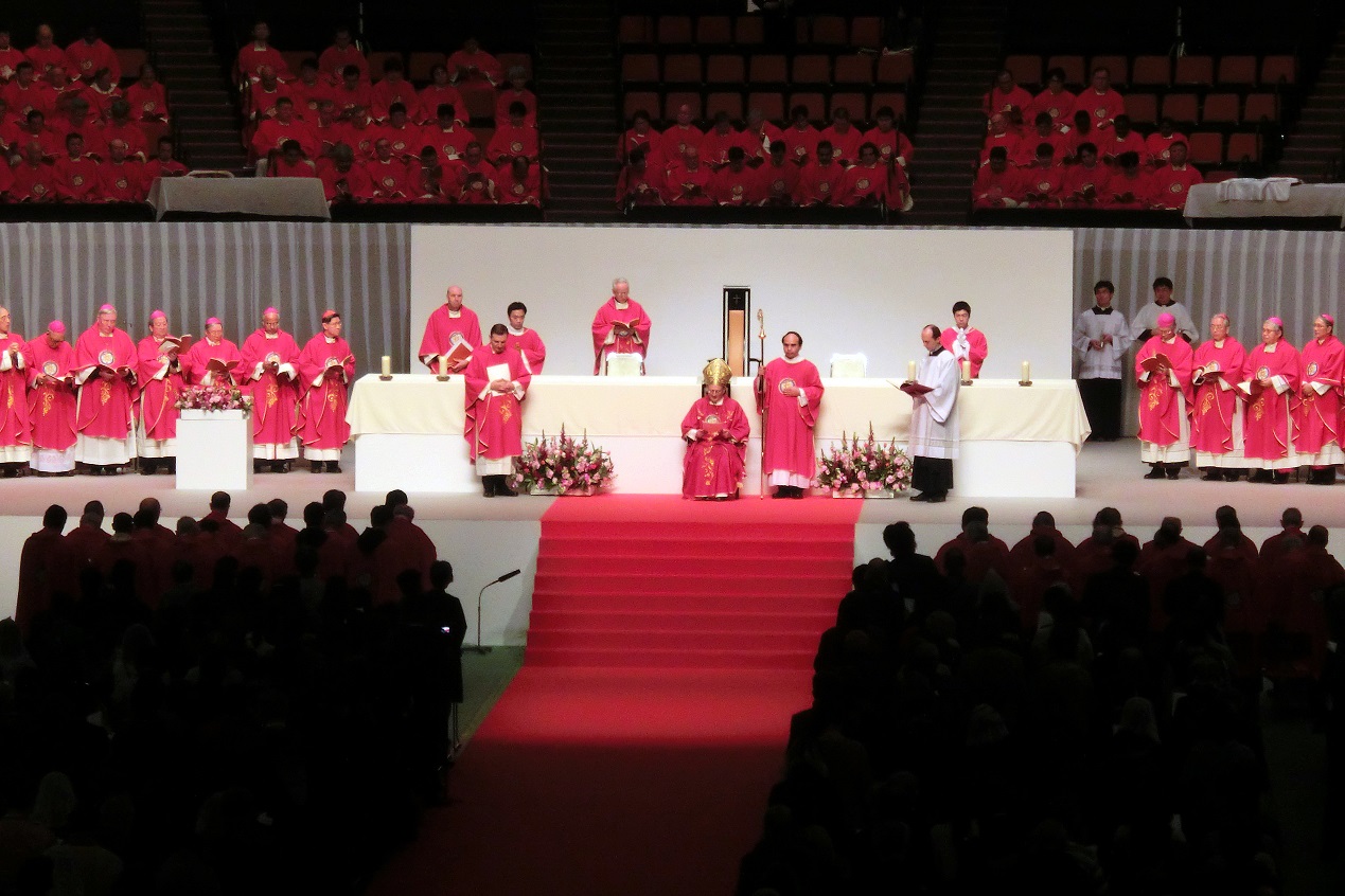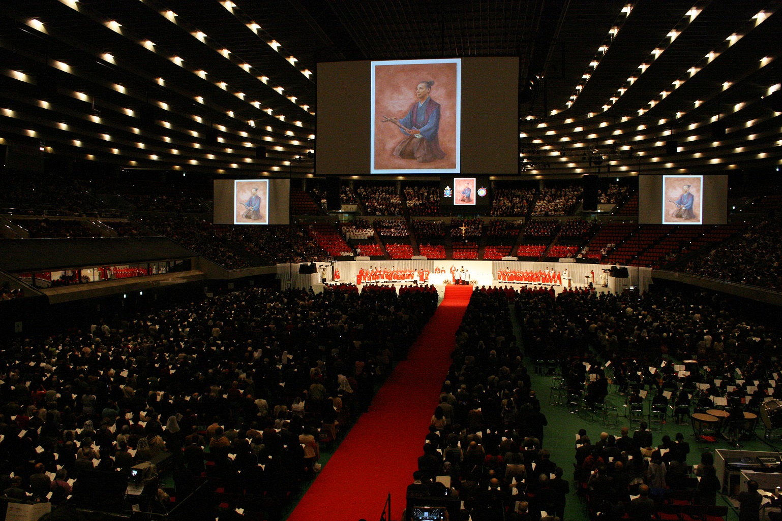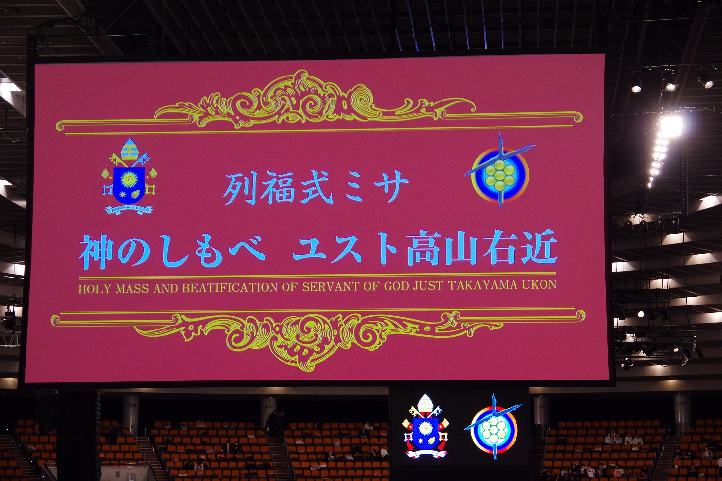 昨年1月21日に教皇フランシスコが殉教者として列福を承認したユスト高山右近の列福式が2月7日(火)正午、信者ら約1万人の参加のもと、大阪城ホール(大阪市)で開催された。列福式は、教皇代理アンジェロ・アマート枢機卿(教皇庁列聖省長官)の司式によって行われた。国内外各地から、長崎からも多くの司祭、修道者、信徒らが参加し、高山右近列福の喜びを分かち合った。