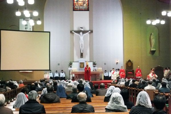 2月7日(火)大阪城ホールでの列福式で福者と宣言されたユスト高山右近。右近の列福を感謝するミサが12日(日)18時半から浦上教会で行われ、主司式の髙見三明大司教、司祭団23人と助祭、多くの修道者、信徒らが祈った。